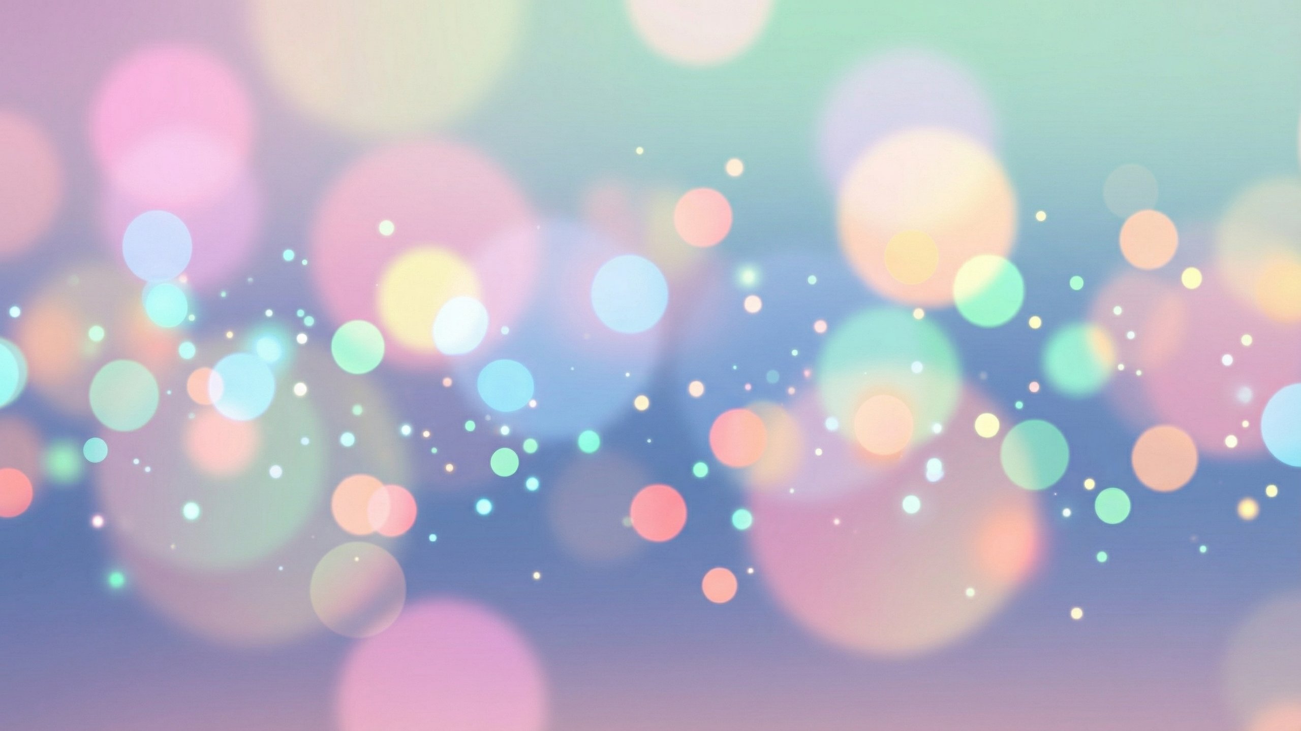 ピンク・ミントグリーン・水色・イエロー・コーラル・ラベンダーなど多彩なパステルカラーのボケ光が、淡いブルーパープルのグラデーション背景に浮かび上がる抽象的なPC壁紙画像です。