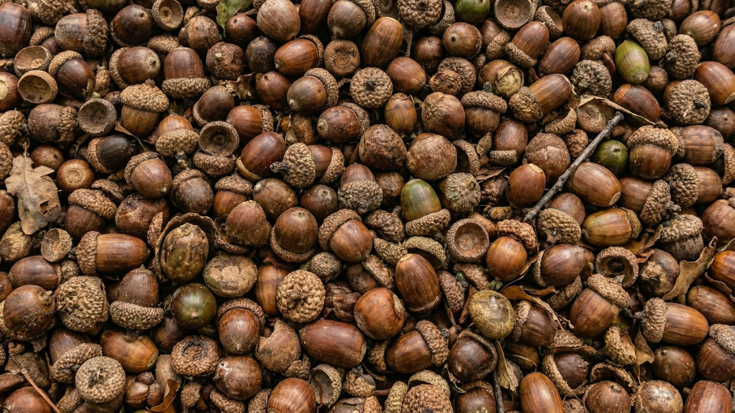 帽子(殻斗)付きのものや実だけのもの、緑がかったものや濃い茶色のものなど、異なる種類・成熟度のどんぐりが混在し、豊かなテクスチャを形成しています。