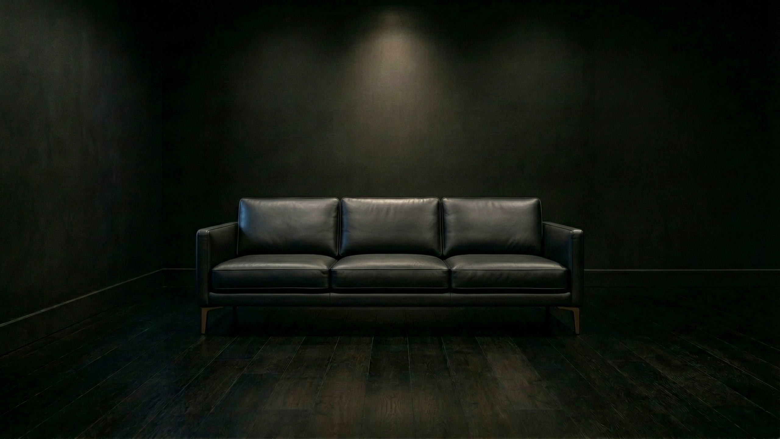 暗闇に佇む黒い3シーターレザーソファ PC壁紙 サンプルビュー