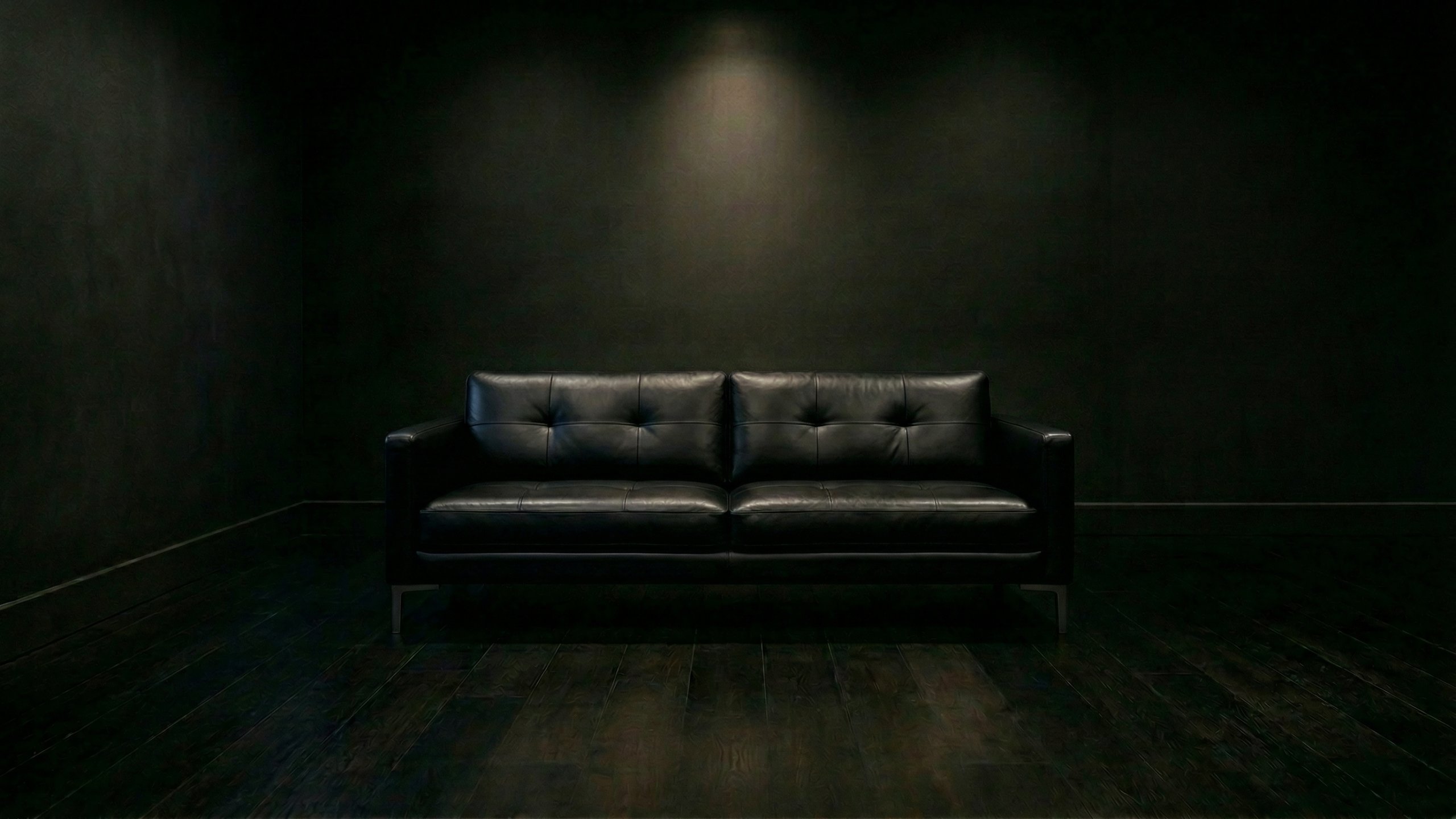 真っ暗な空間の中央にスポットライトを浴びた黒いレザーソファが佇む、シネマティックなPC壁紙です。