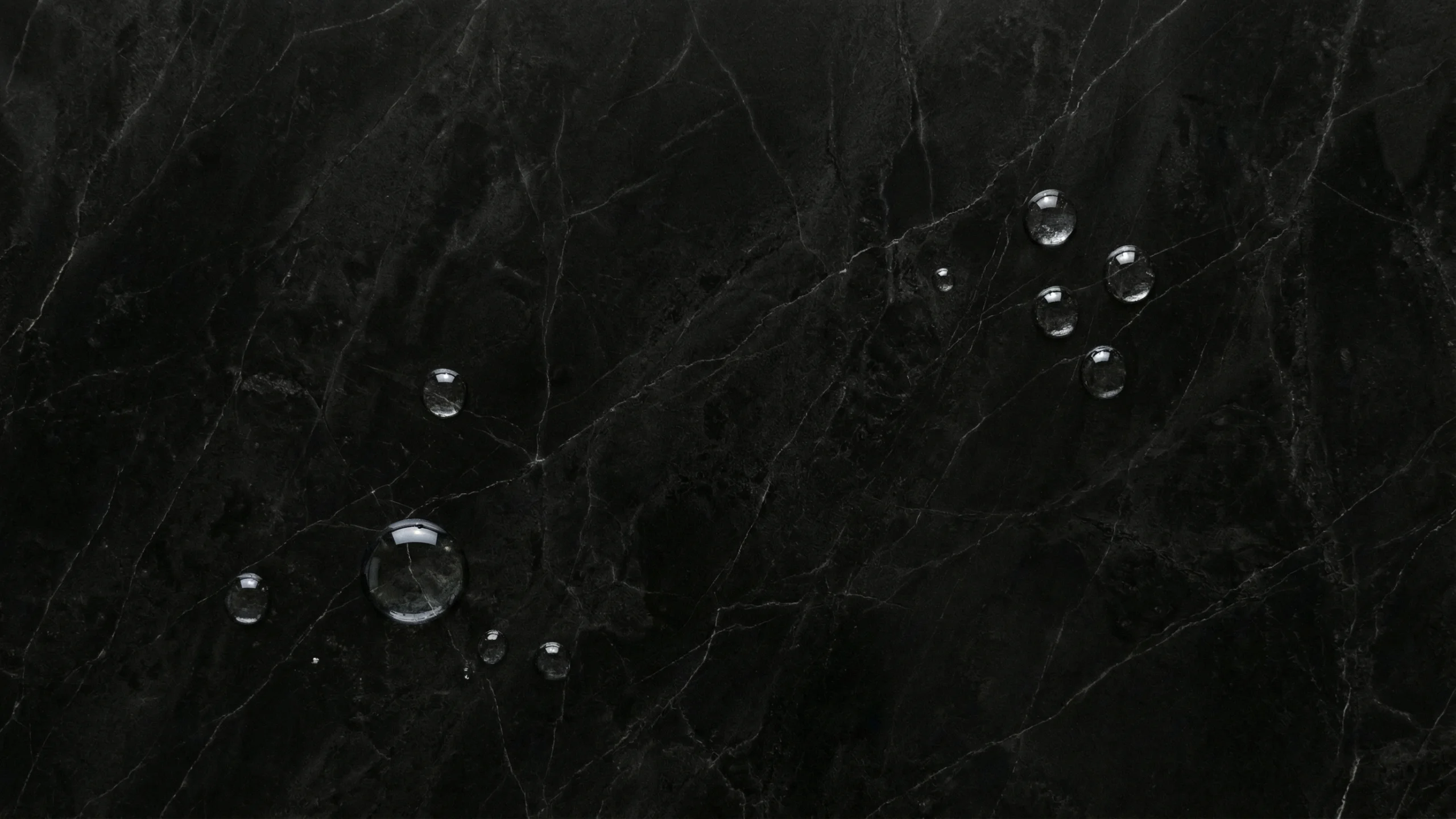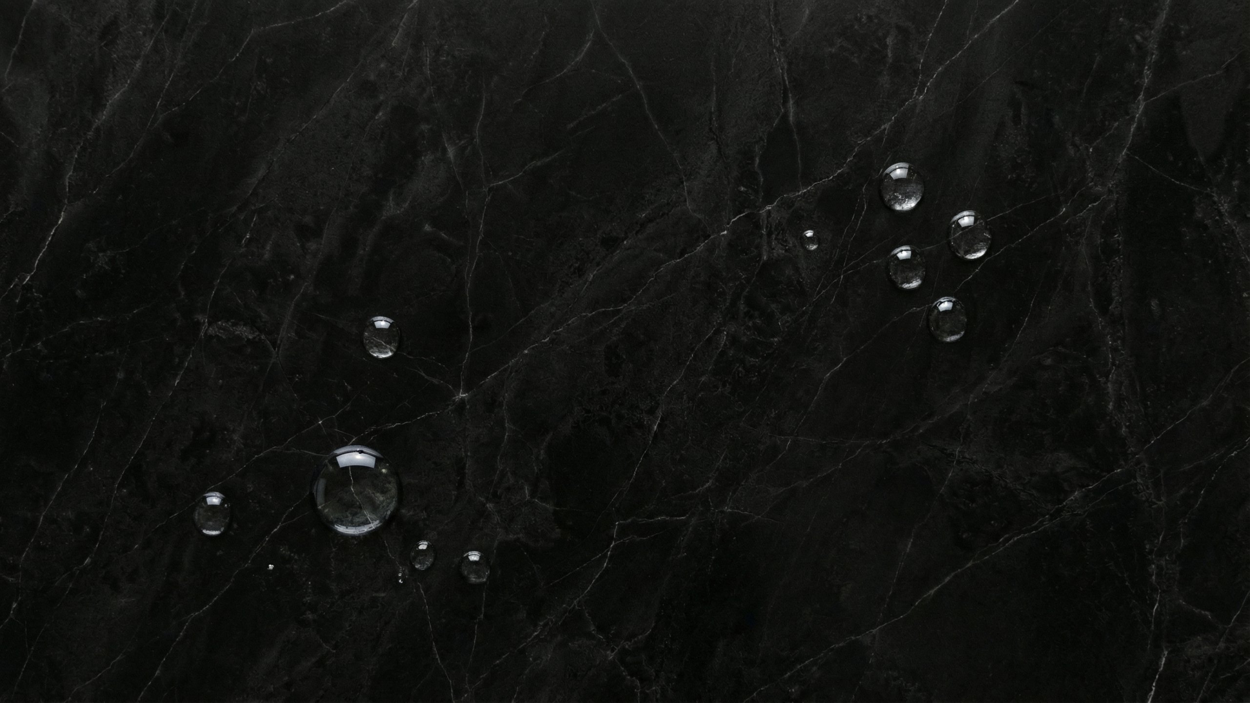 深みのある黒大理石の表面に、透明な水滴が点在するPC壁紙素材です。