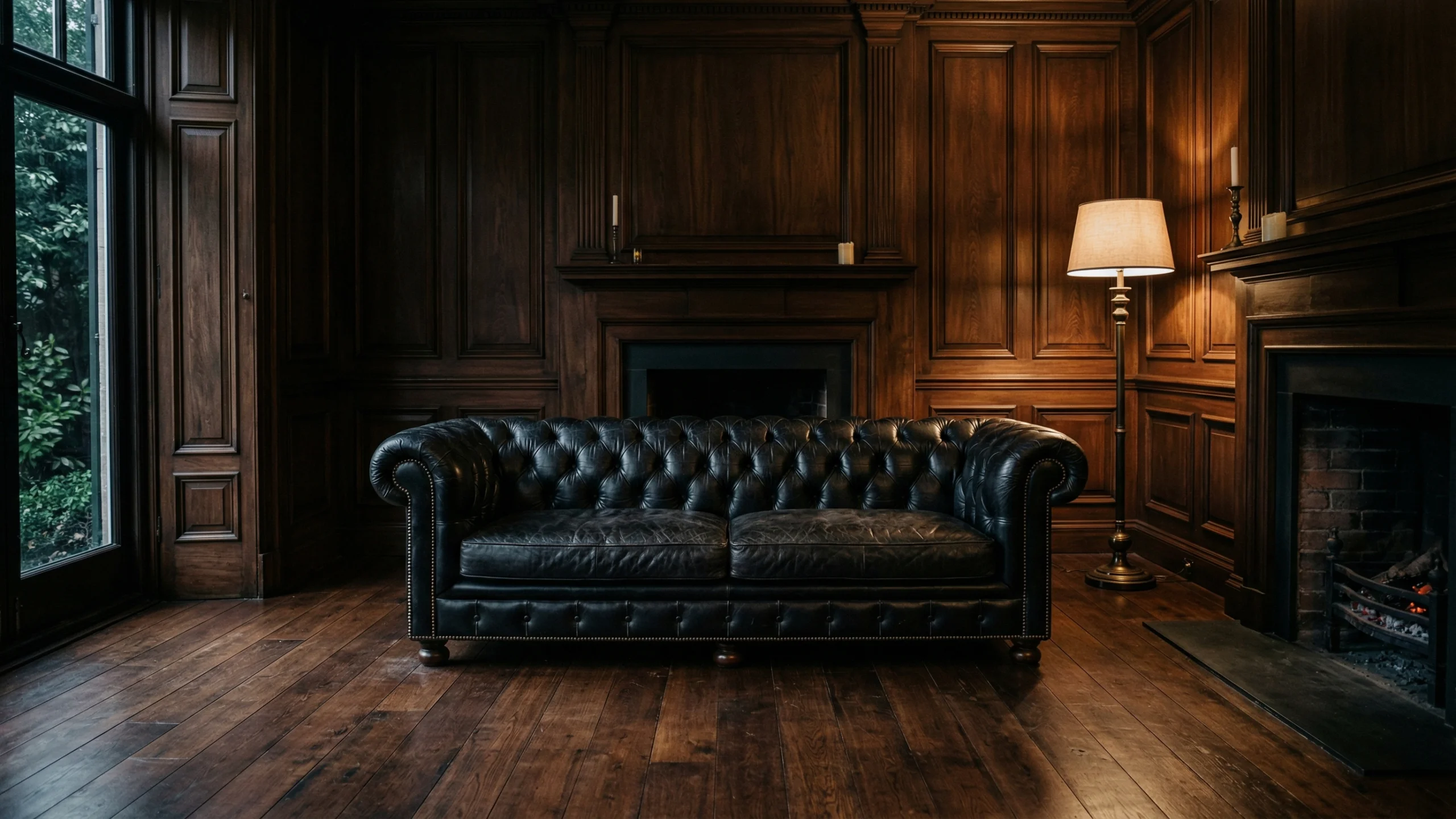 黒いチェスターフィールドソファが暖炉の前に置かれた構図は、英国紳士の書斎そのものの重厚感と気品を醸し出しており、クラシックでムーディーなデスクトップ背景として最適です。