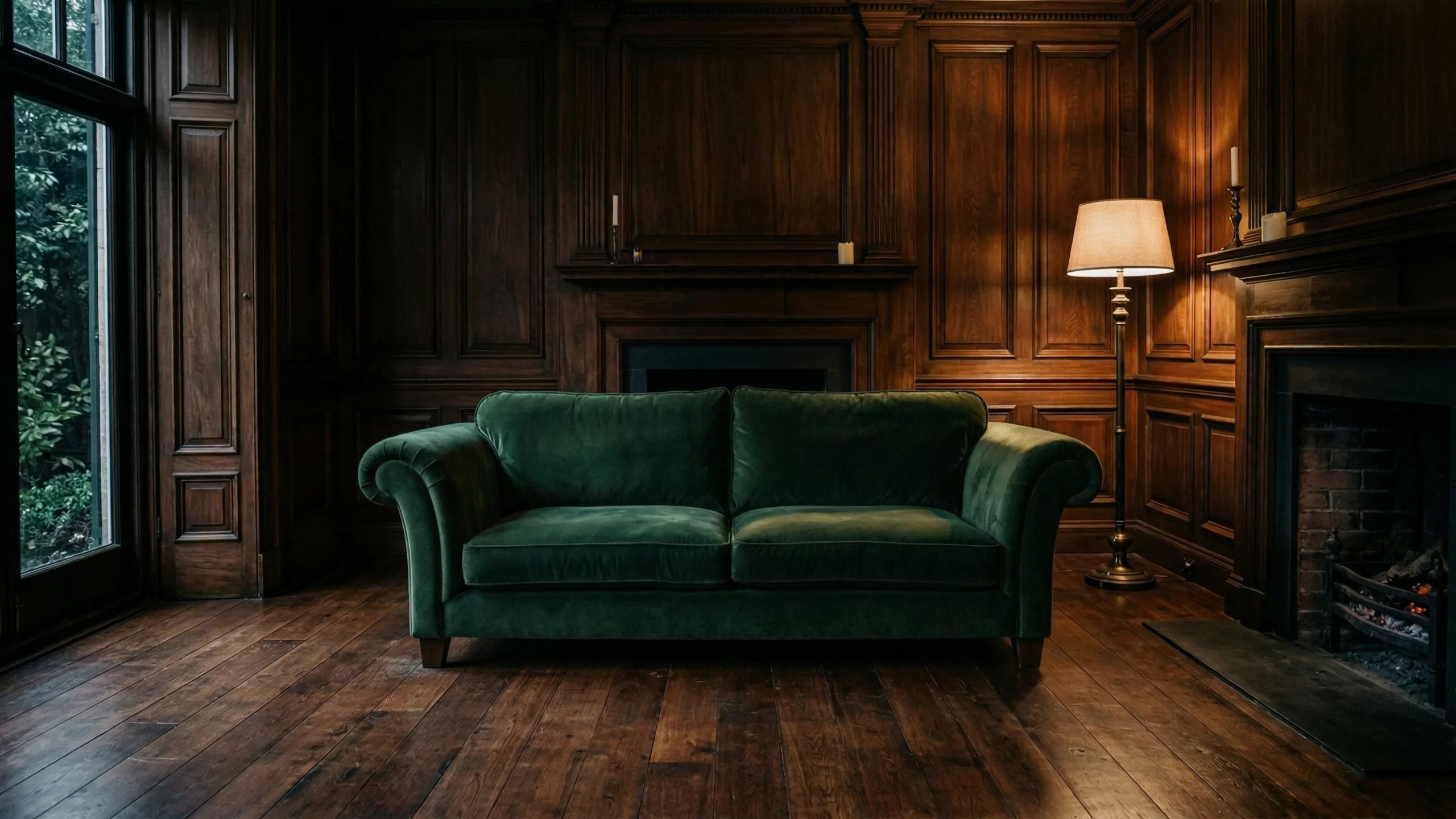 ロールアームが特徴的なエメラルドグリーンのベルベットソファの深みのある色彩がダークウッドと鮮やかに対比し、クラシックと現代的な豪華さが融合した印象的なデスクトップ背景として最適です。