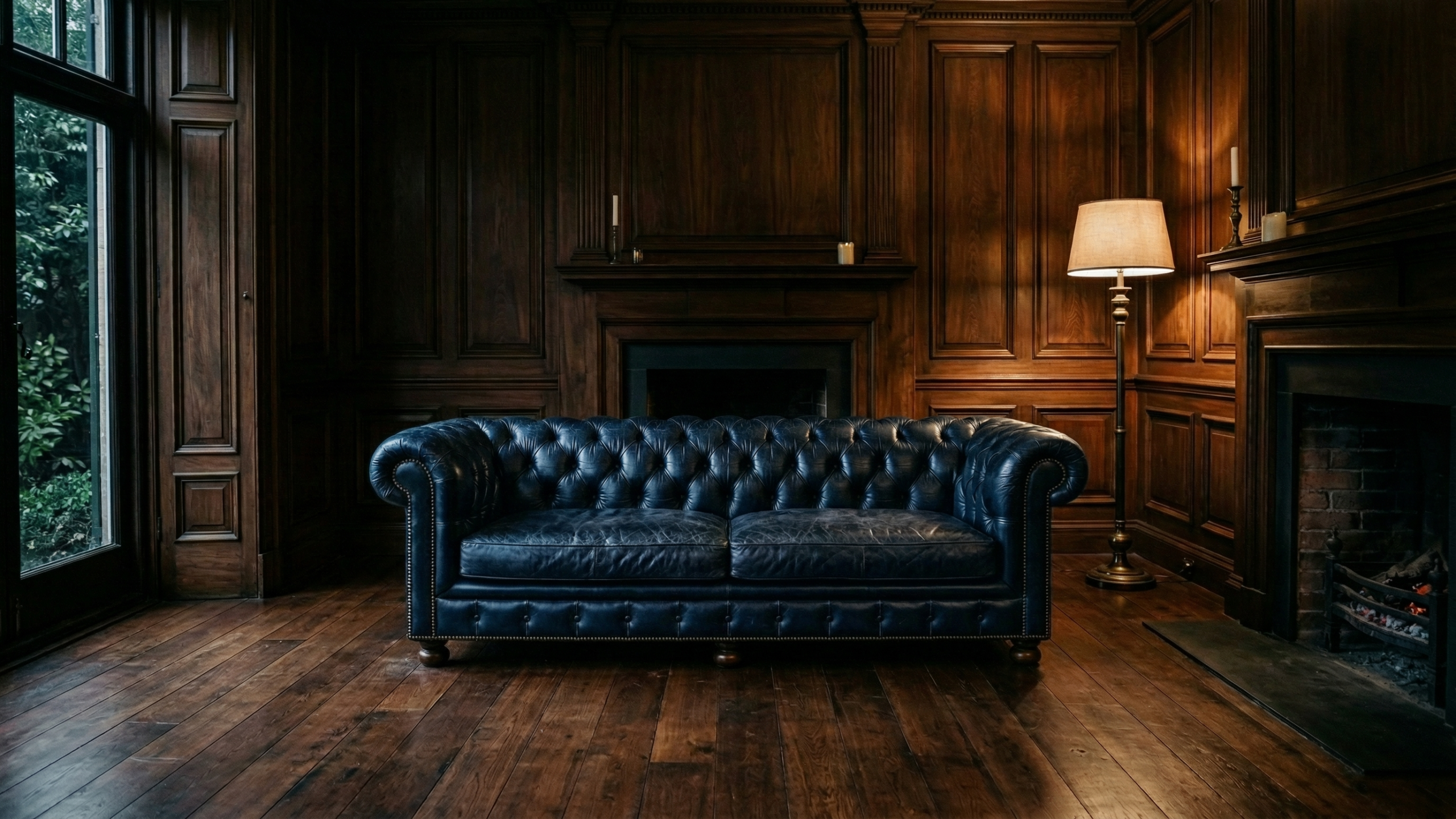 ネイビーブルーのチェスターフィールドソファが暖炉の前に置かれた構図は、深みのあるブルーとダークウッドの重厚な質感が鮮やかに対比し、英国紳士の書斎の格調と気品を醸し出すデスクトップ背景として最適です。