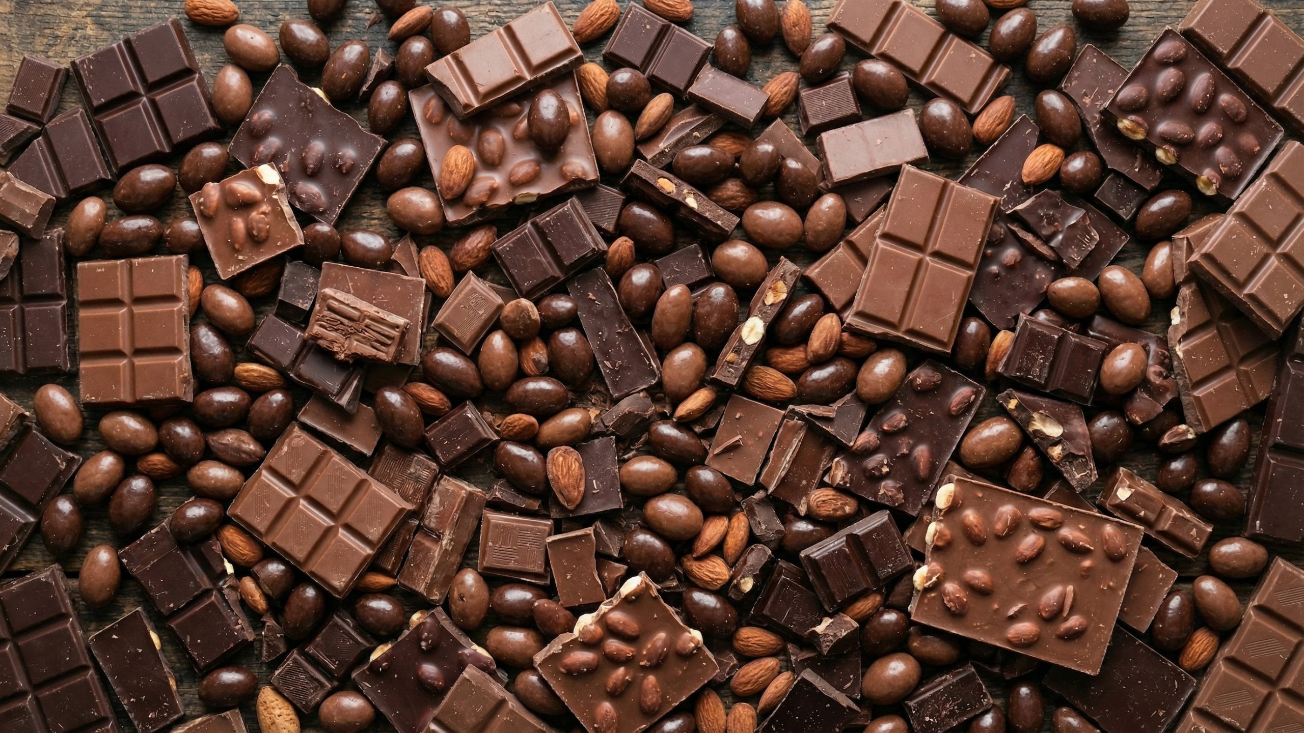 割れたチョコレートの板とアーモンド、チョコがけアーモンドが木製テーブルの上に贅沢に散りばめられた、真上から撮影したトップダウンビューのPC壁紙画像です。