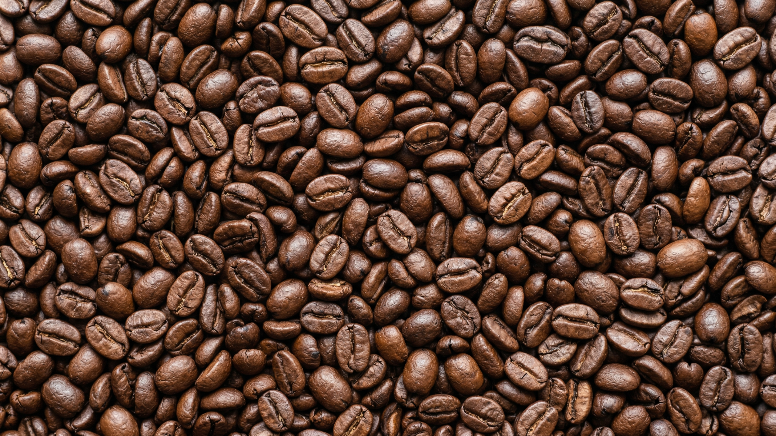 焙煎されたコーヒー豆が画面いっぱいに敷き詰められた、俯瞰アングルの接写PC壁紙です。