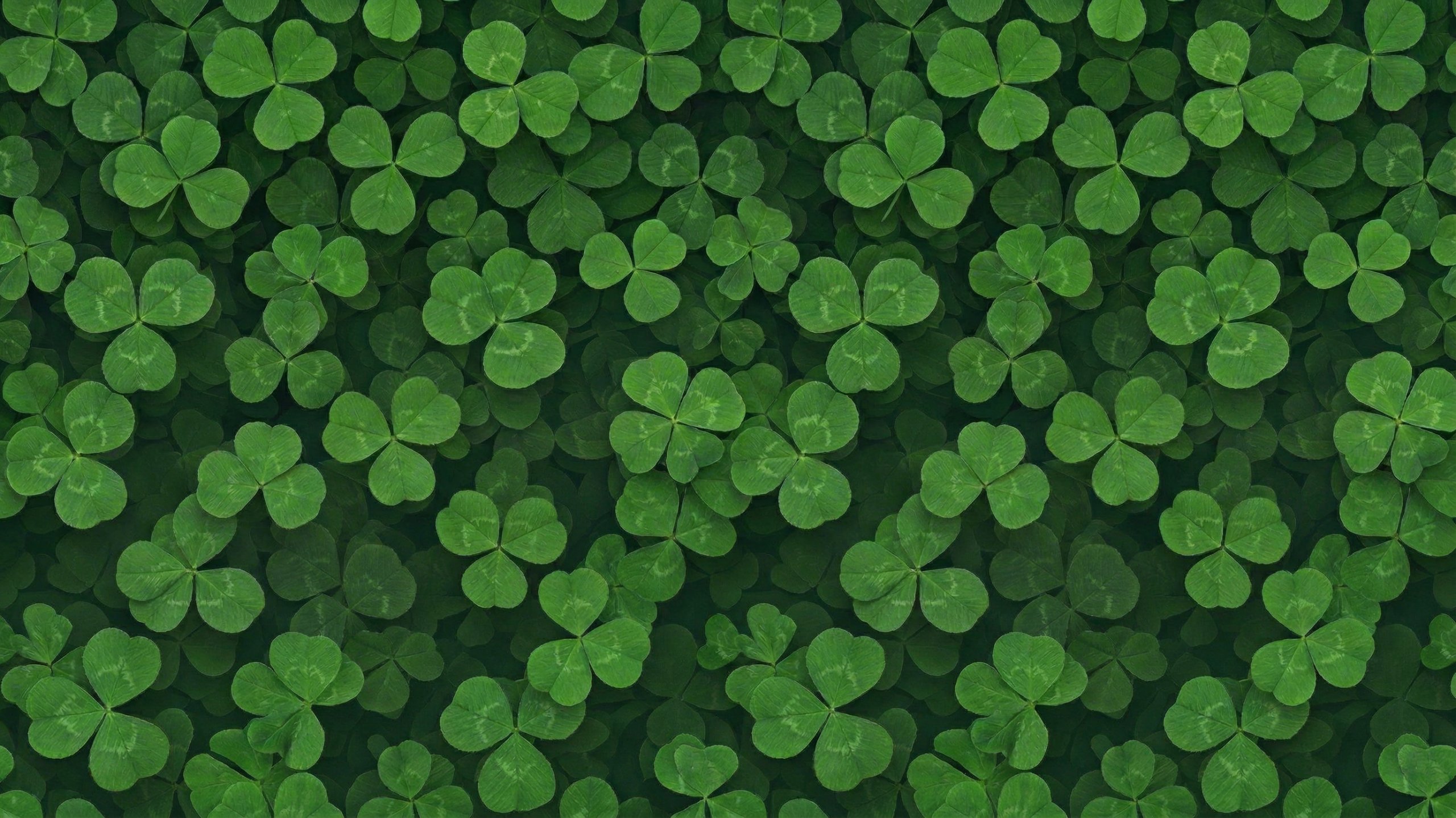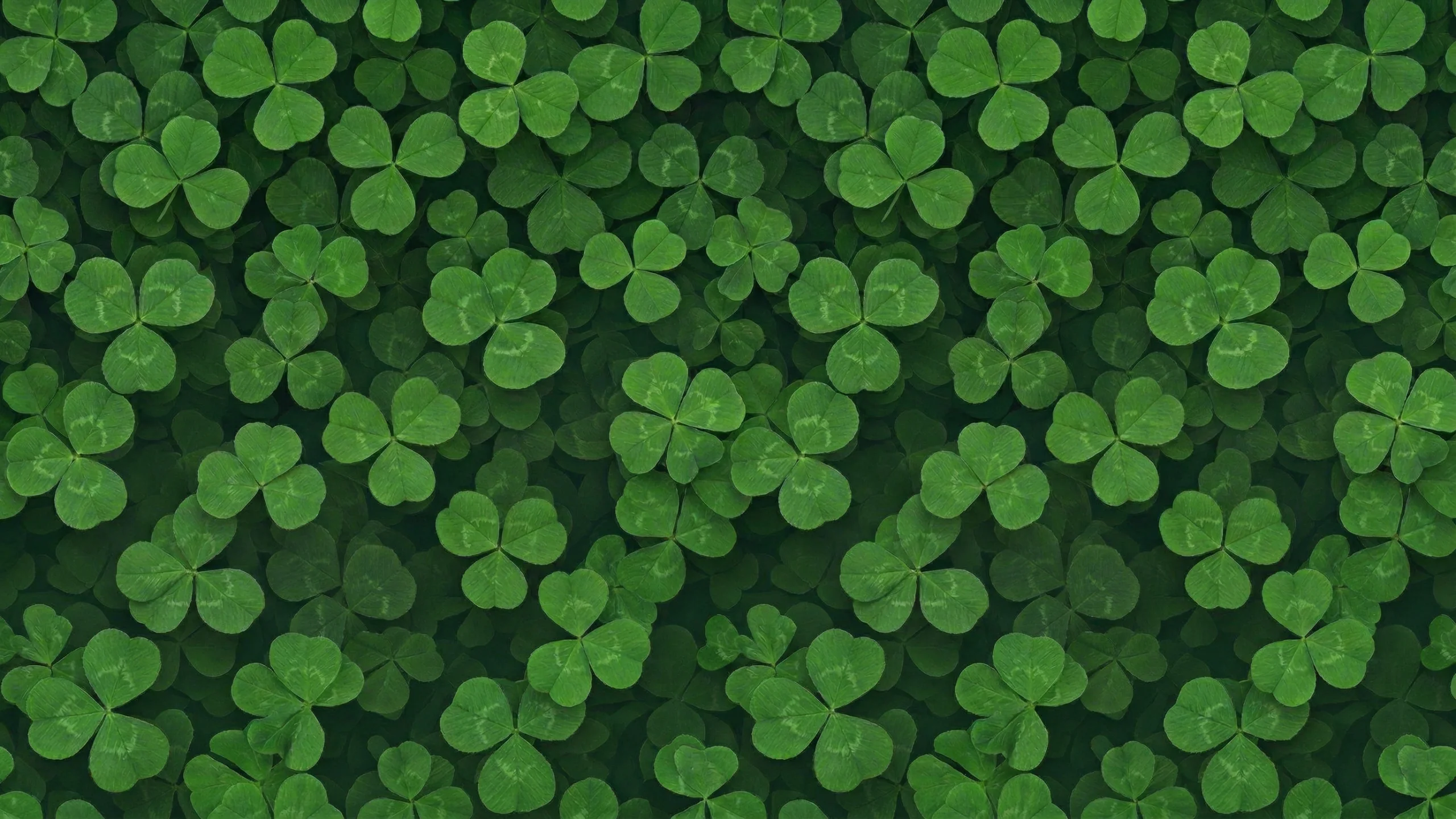 みずみずしいグリーンのクローバーが画面いっぱいに敷き詰められた、上から見下ろした俯瞰アングルのPC壁紙です。