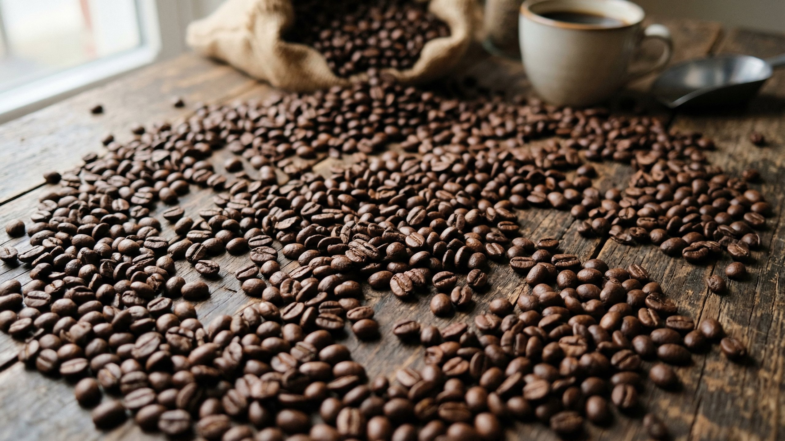 古びた木製テーブルの上にコーヒー豆が散りばめられ、奥には麻袋とコーヒーカップが置かれたカフェスタイルのPC壁紙です。