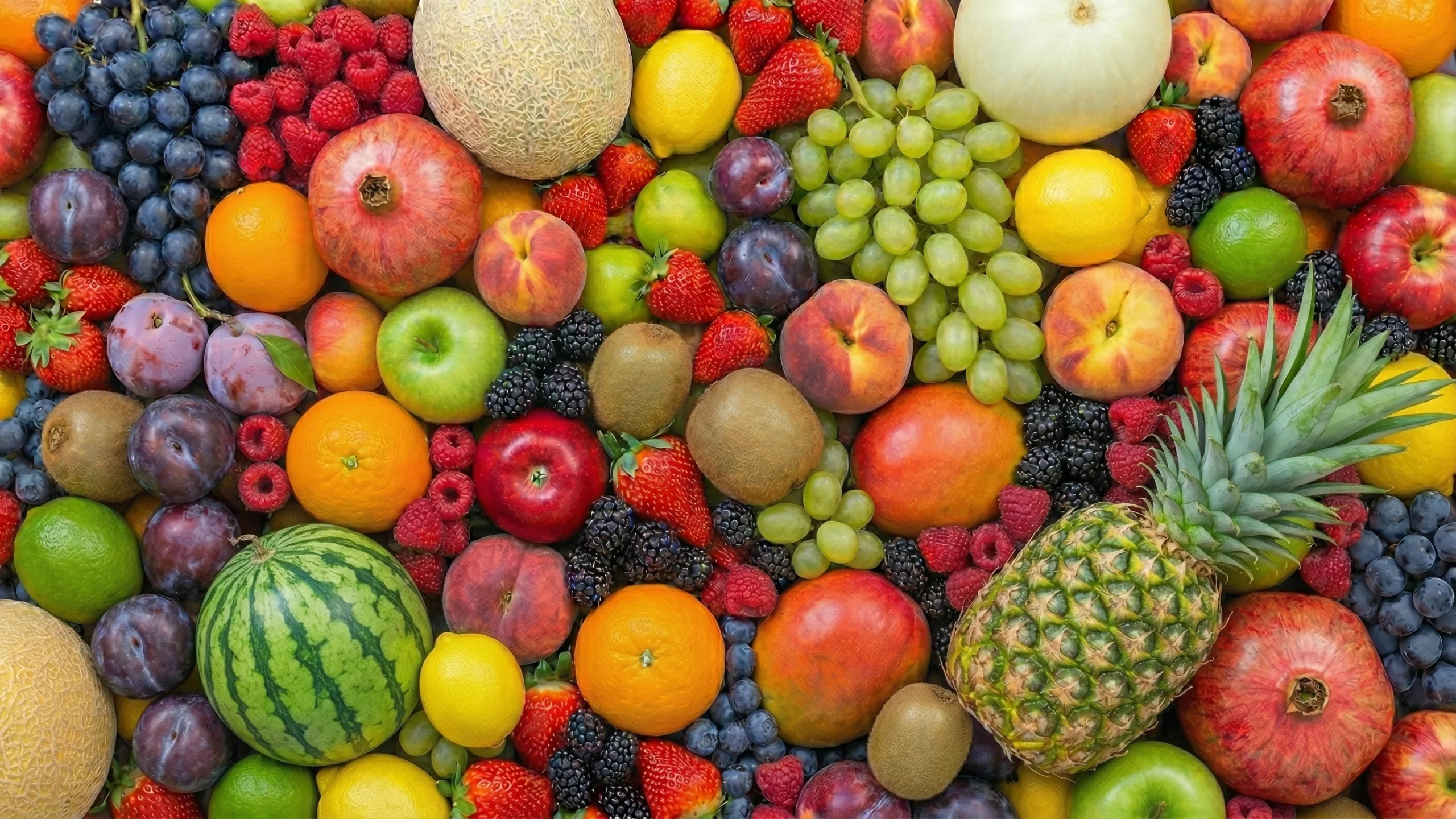 スイカ・パイナップル・メロン・ブドウ・いちご・桃・りんご・オレンジ・レモン・ライム・キウイ・プラム・ブルーベリー・ラズベリー・ブラックベリー・ザクロ・マンゴーなど、多種多様なフルーツが画面いっぱいに敷き詰められたPC壁紙画像です。
