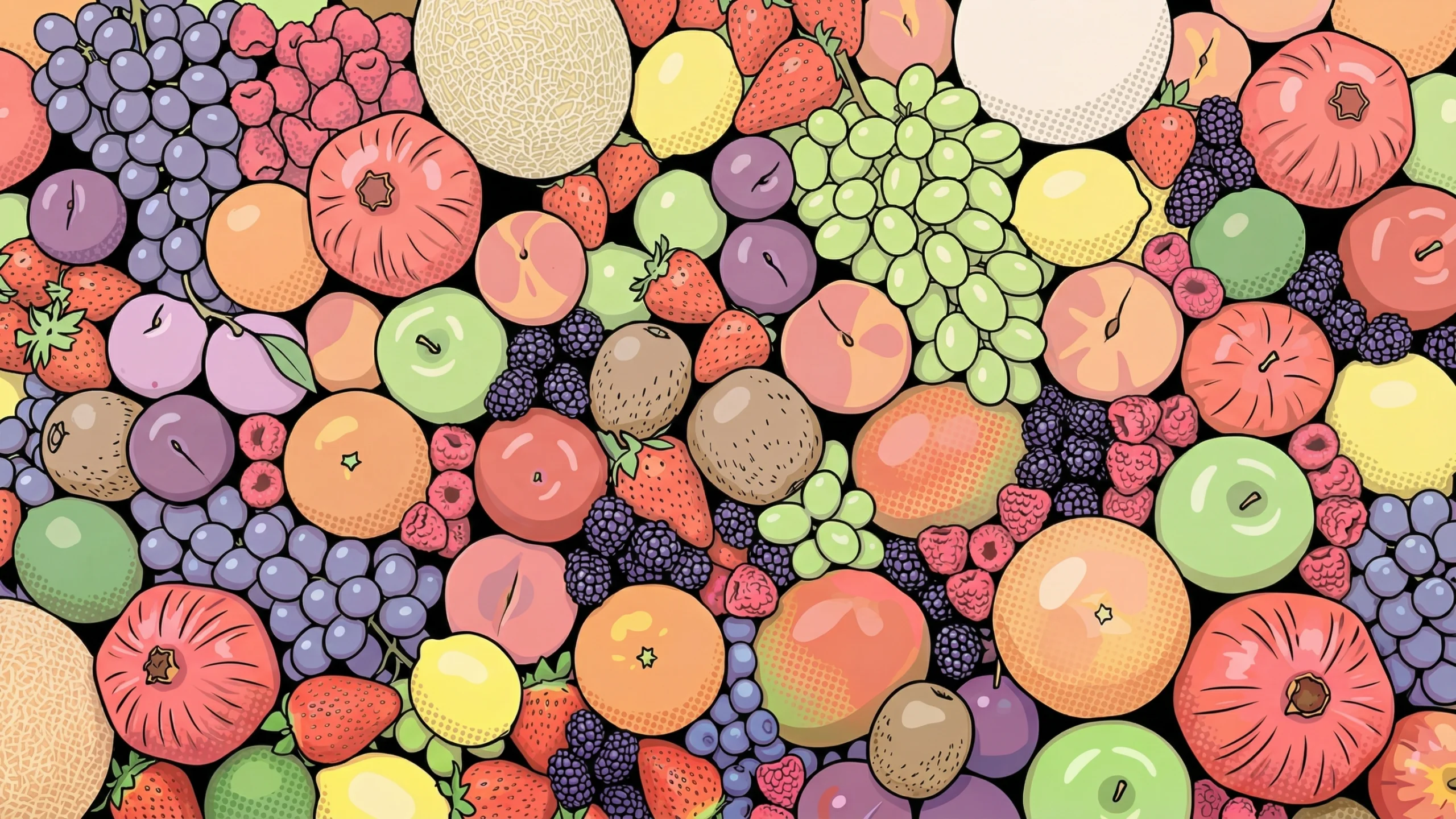 ブドウ・いちご・桃・りんご・オレンジ・レモン・キウイ・プラム・ブルーベリー・ラズベリー・ブラックベリー・ザクロ・メロン・マンゴーなど多種多様なフルーツをパステルカラーのポップアートタッチで描いたPC壁紙画像です。
