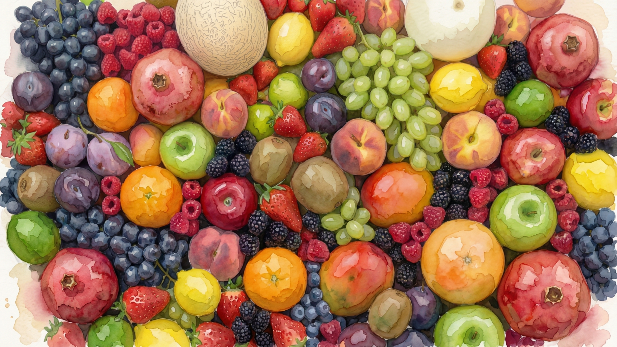 ブドウ・いちご・桃・りんご・オレンジ・レモン・ライム・キウイ・プラム・ブルーベリー・ラズベリー・ブラックベリー・ザクロ・メロン・マンゴーなど多種多様なフルーツを水彩画タッチで描いたPC壁紙画像です。