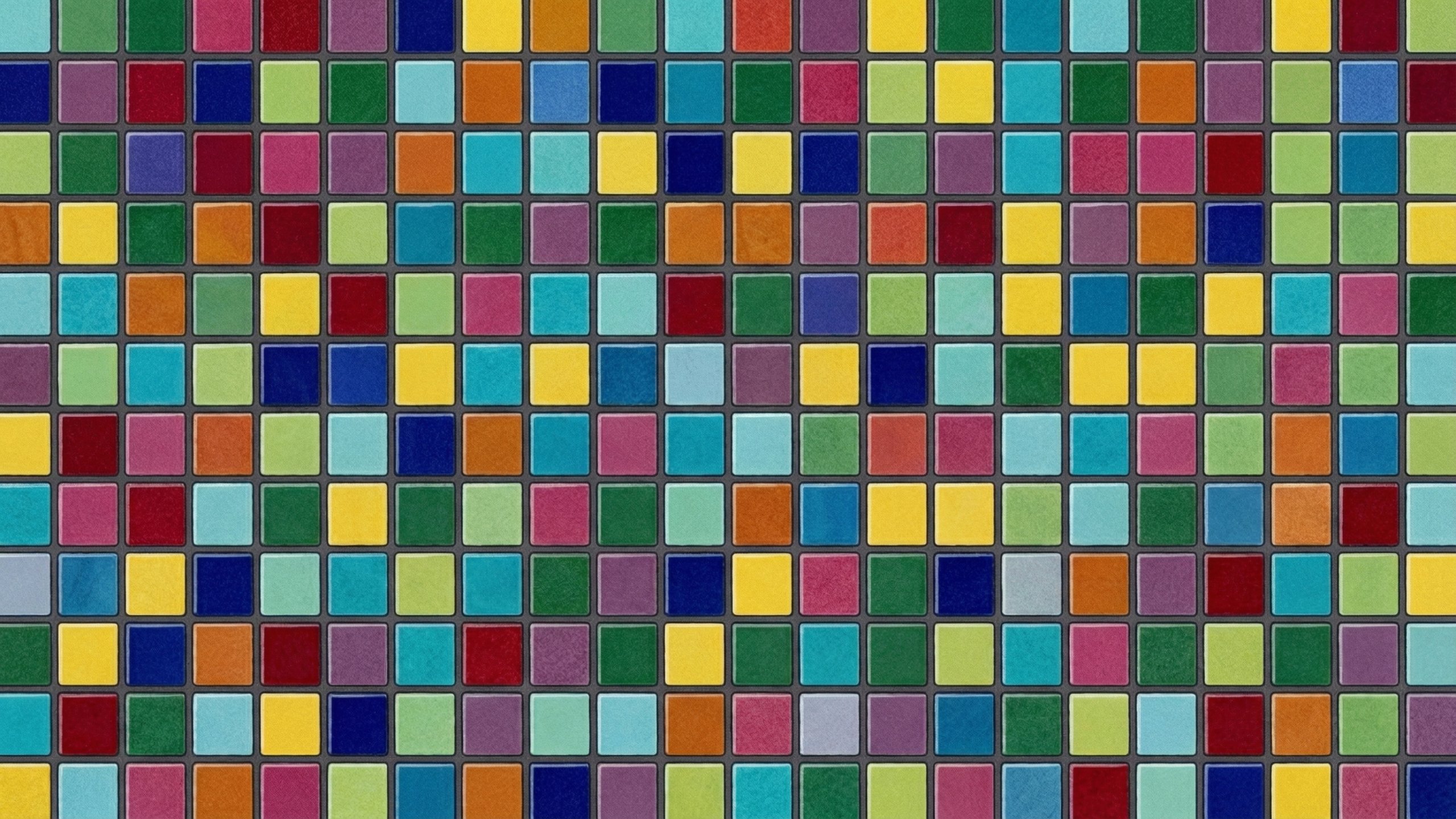 赤・黄・緑・青・オレンジ・ピンク・紫・水色など多彩な色のタイルがランダムに敷き詰められた、鮮やかなモザイクタイル柄のPC壁紙画像です。