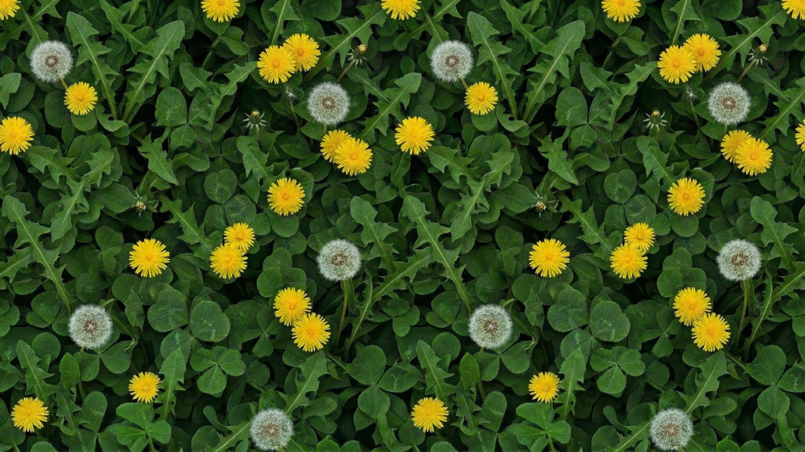 黄色いタンポポの花と綿毛が、緑のクローバーやタンポポの葉が密生する草原に散りばめられたPC壁紙です。