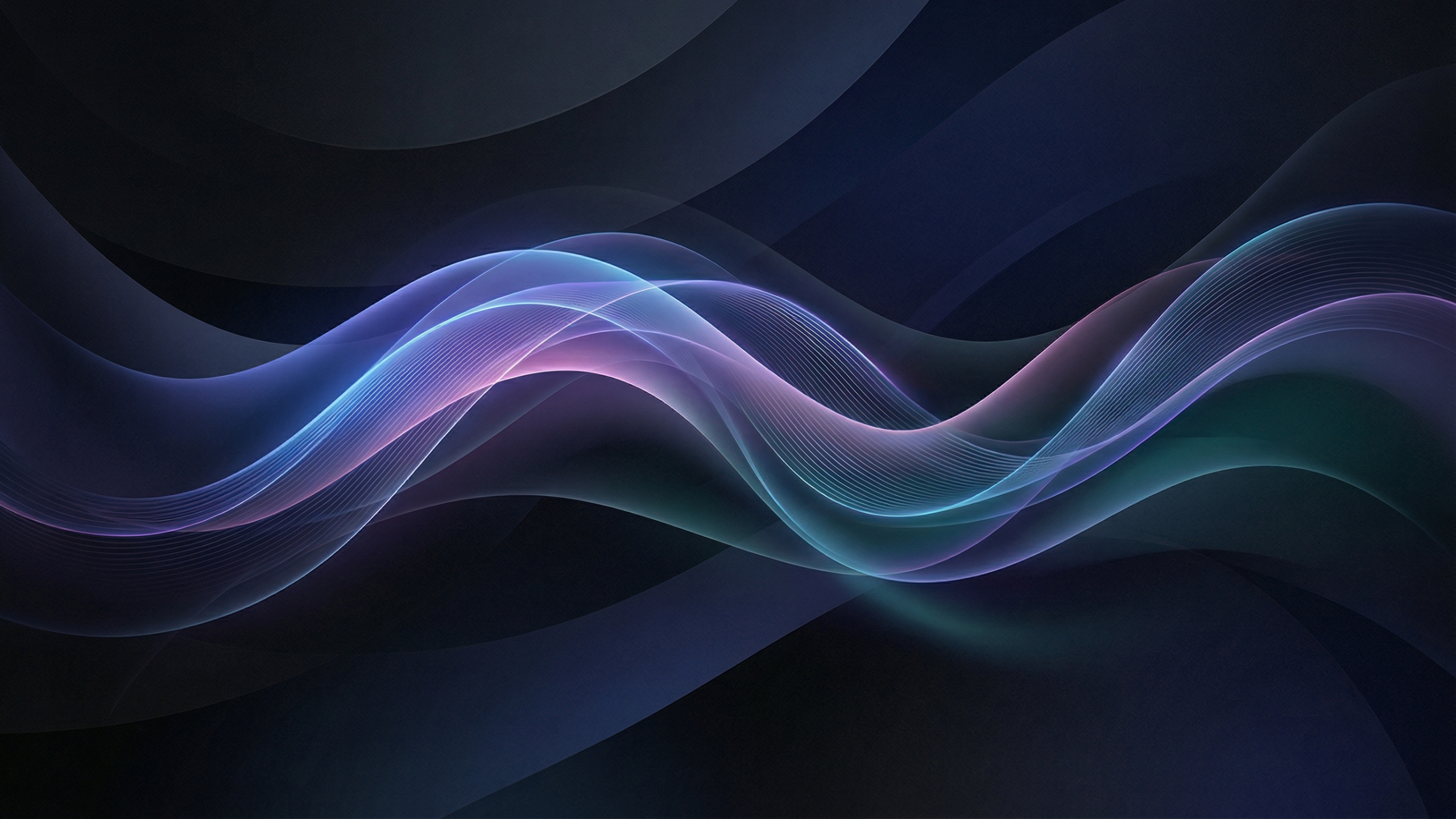 漆黒とダークネイビーの背景に、ネオンブルー・パープル・ティールグリーンに発光する滑らかな波形が流れる抽象的なPC壁紙です。
