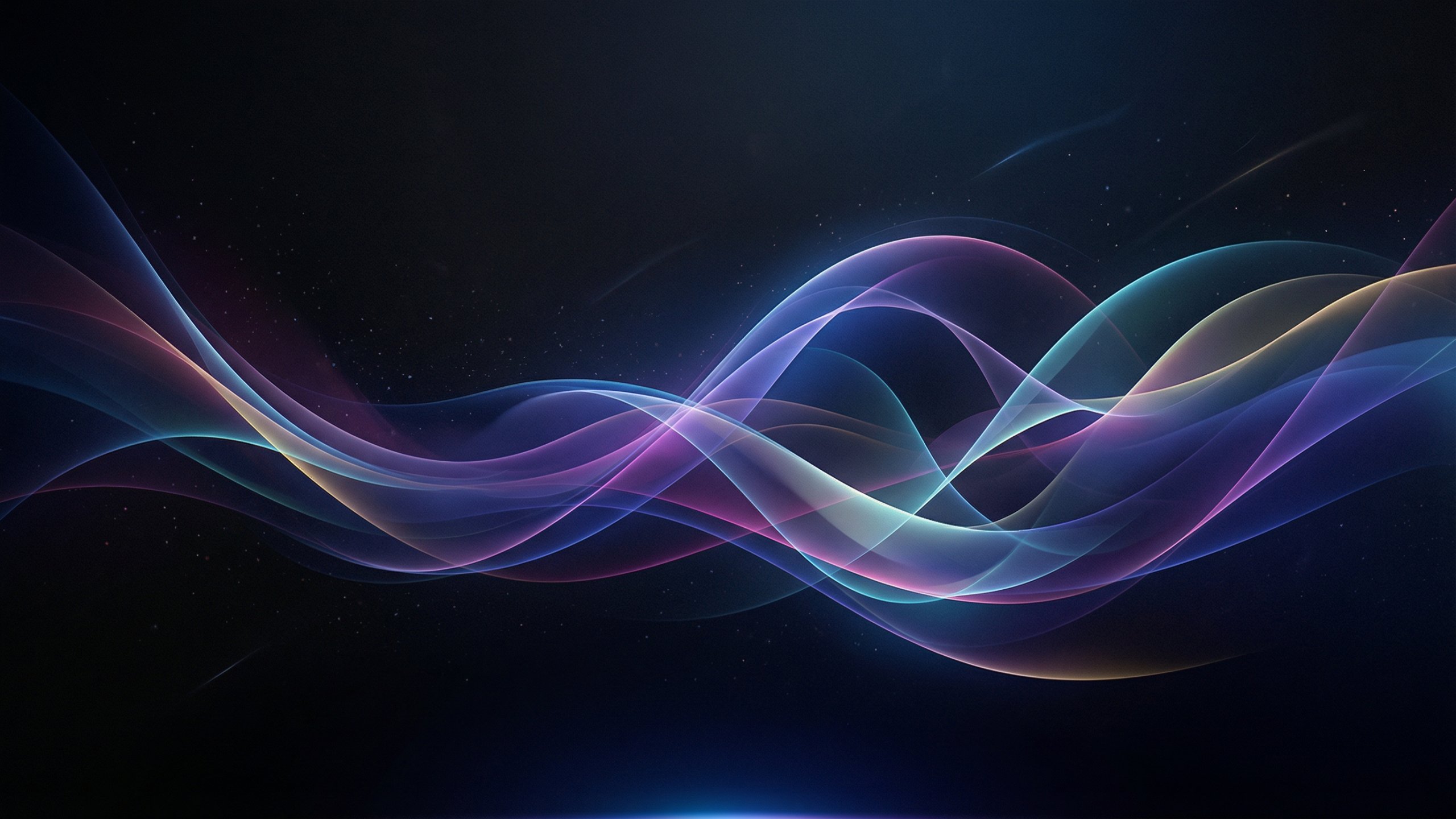 漆黒とダークネイビーの背景に、ネオンブルー・パープル・ティールグリーンに発光する滑らかな波形が流れる抽象的なPC壁紙です。
