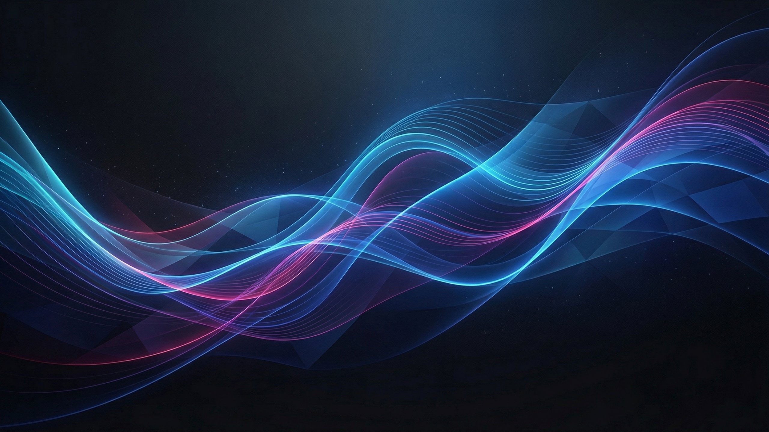 漆黒とダークネイビーの背景に、ネオンブルー・パープル・ティールグリーンに発光する滑らかな波形が流れる抽象的なPC壁紙です。