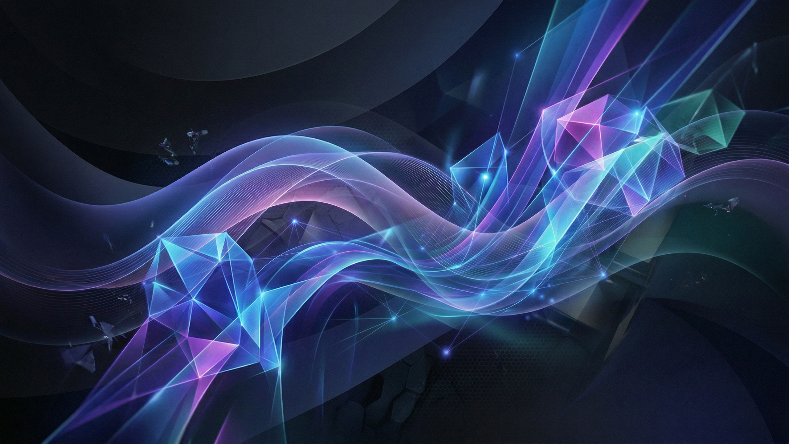 テクノロジー・AI・音楽ビジュアライザーを連想させるスタイリッシュなデザインで、ダークモード対応のデスクトップ背景・プレゼンテーション素材として最適な壁紙です。