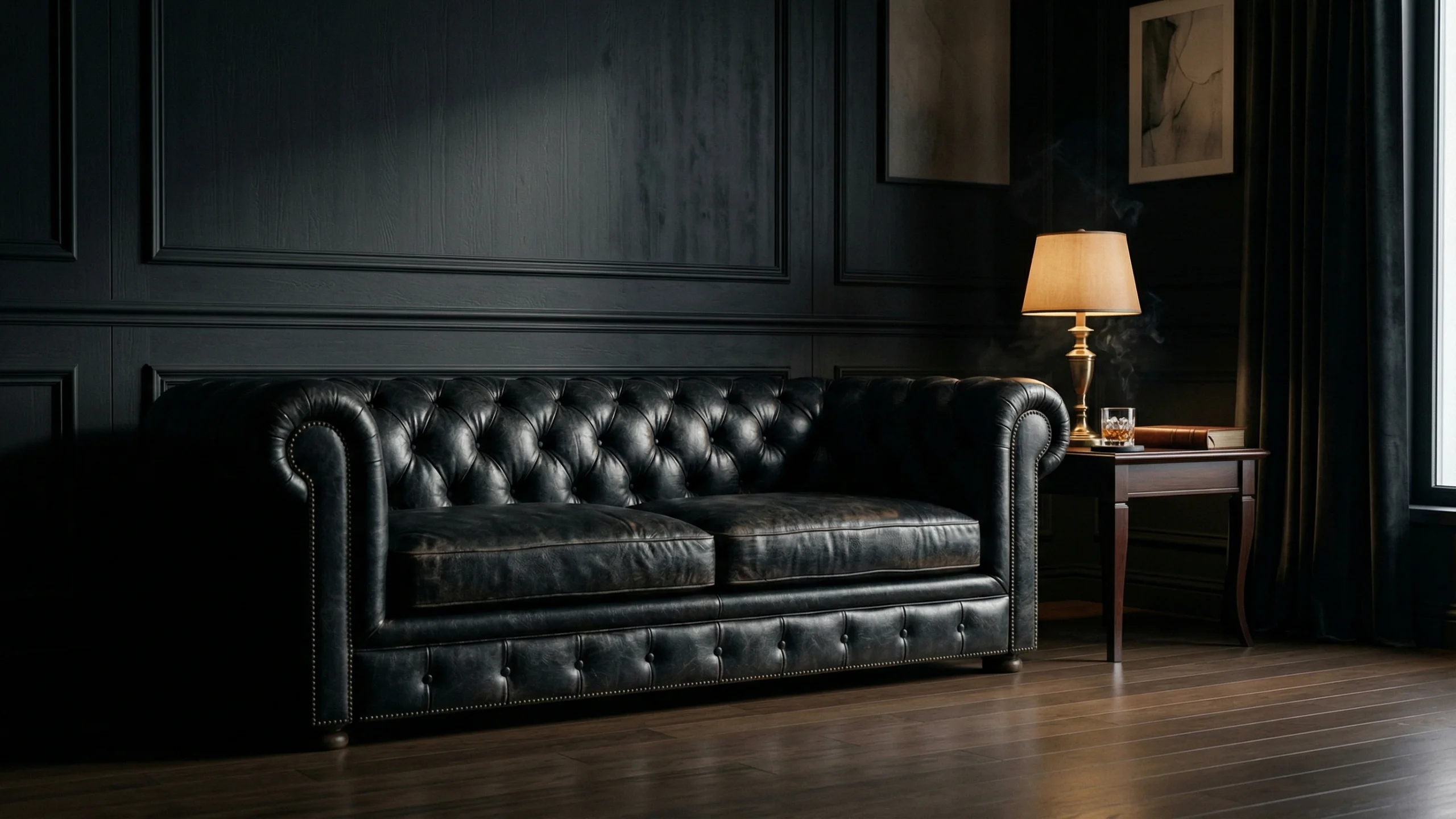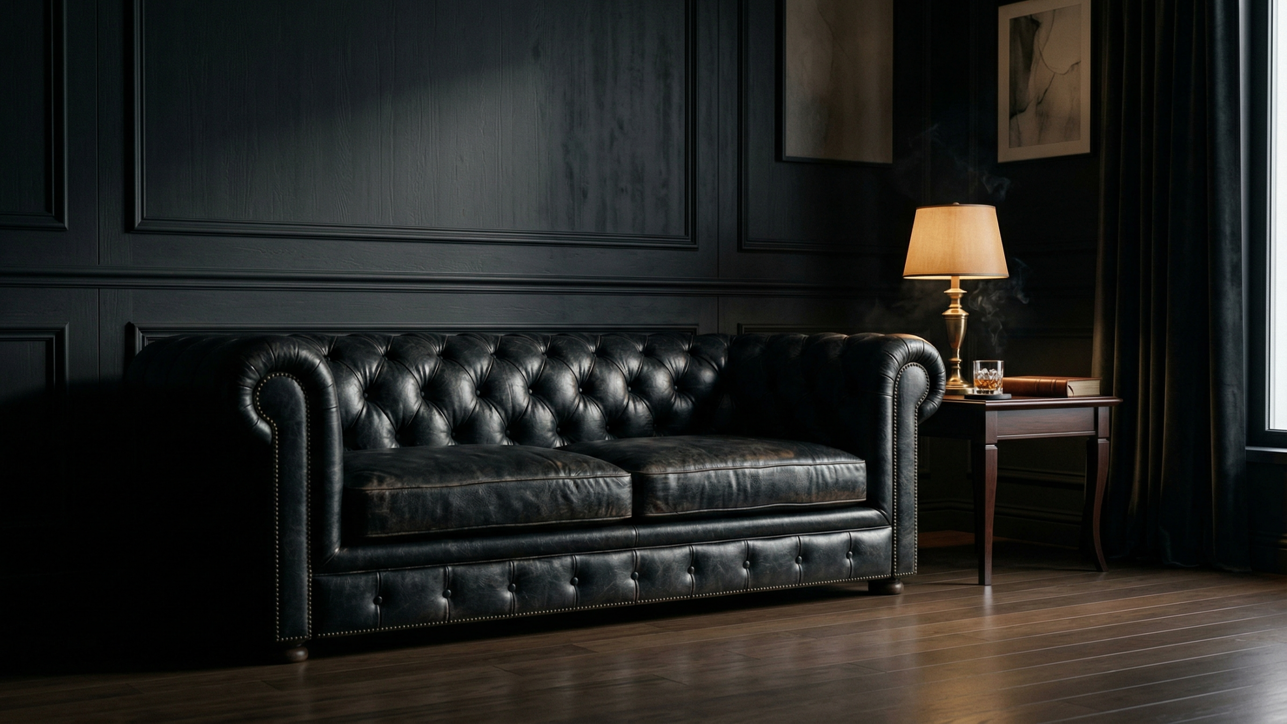 黒いチェスターフィールドソファと腰壁パネル、真鍮製テーブルランプ、ウイスキーグラスが置かれたサイドテーブルが印象的な、ダークラグジュアリーなリビングルームのPC壁紙です。