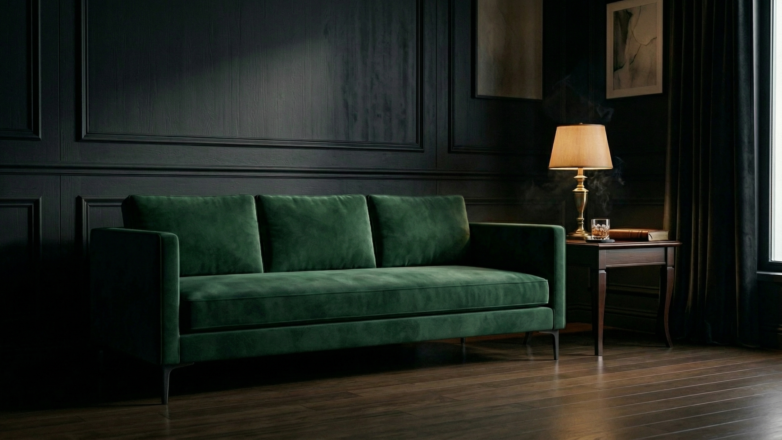 3シートクッションとスリムな金属脚が特徴的なモダンなソファの深みのあるグリーンが黒い壁とダークウッドの床に映え、高級感と落ち着きを兼ね備えたムーディーなデスクトップ背景として最適です。