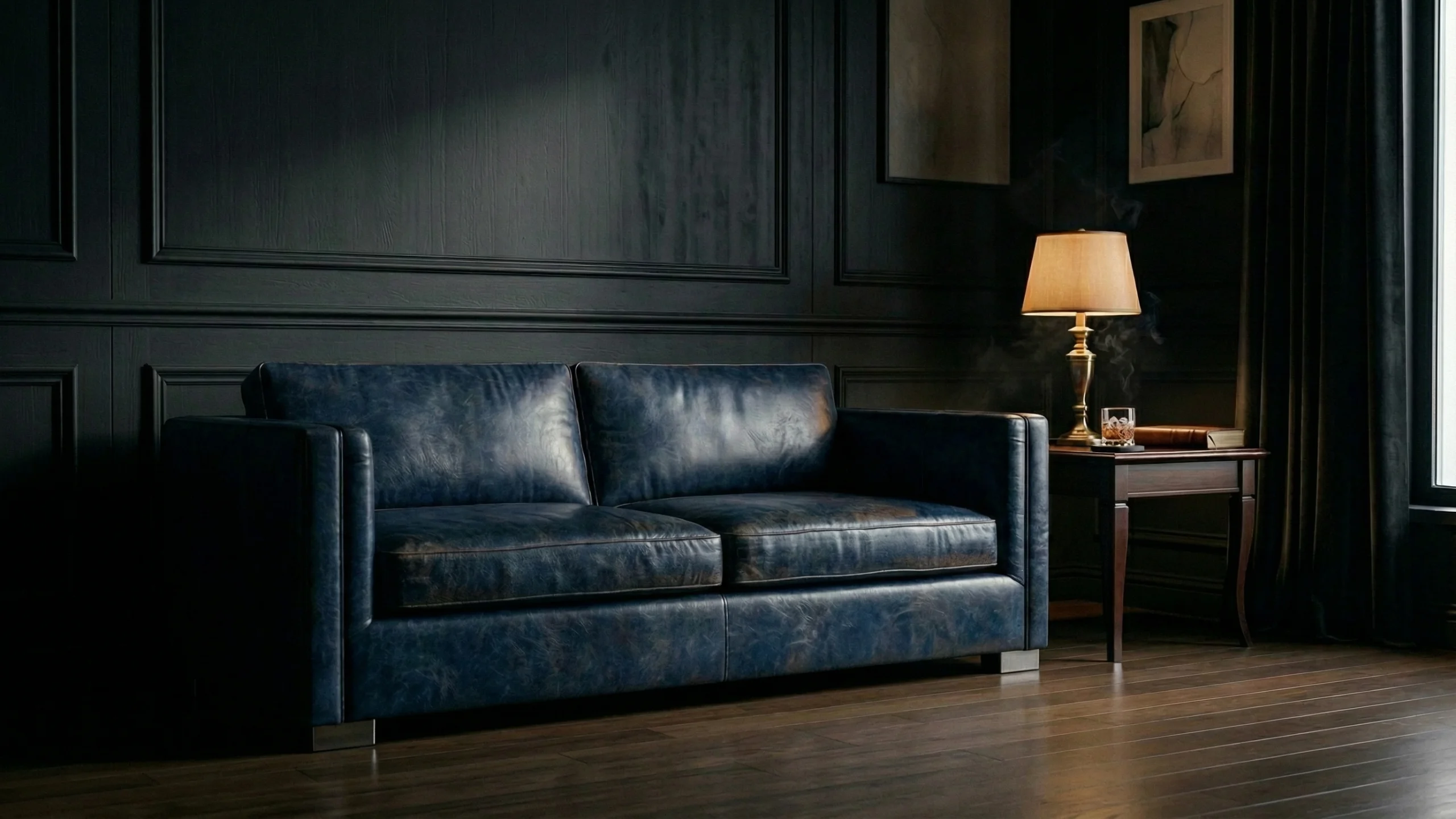 ダークラグジュアリーなリビングルーム(ネイビーレザーソファ) PC壁紙 サンプルビュー