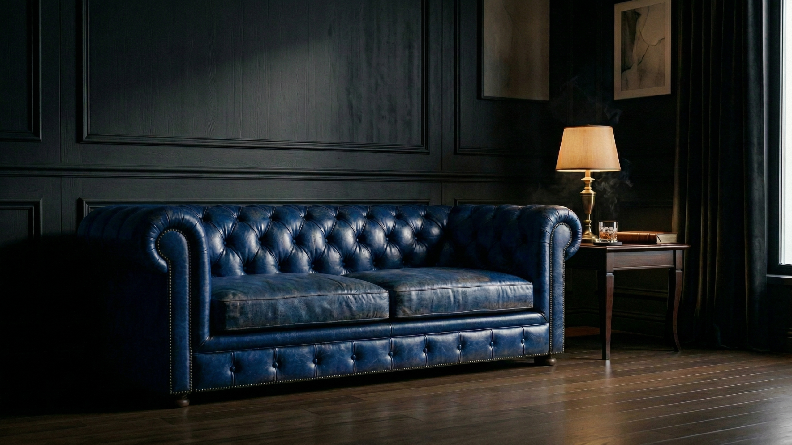 タフティングとスタッズ装飾が施されたクラシックなソファの鮮やかなブルーが黒い壁とダークウッドの床に映え、気品と存在感を放つムーディーなデスクトップ背景として最適です。