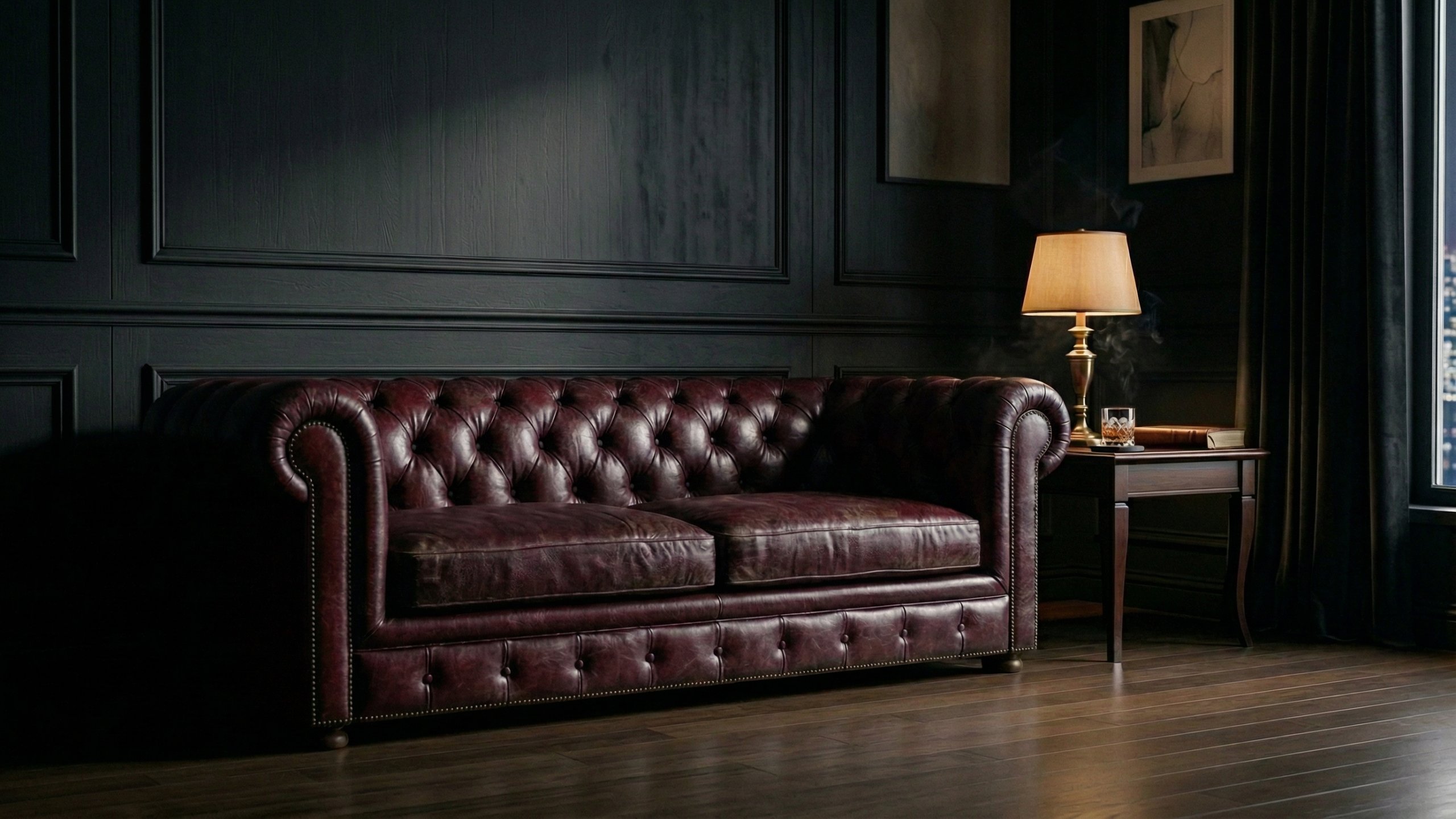 タフティングとスタッズ装飾が施されたクラシックなソファの深みのあるワインレッドが黒い壁とダークウッドの床に映え、重厚感と気品を漂わせるムーディーなデスクトップ背景として最適です。