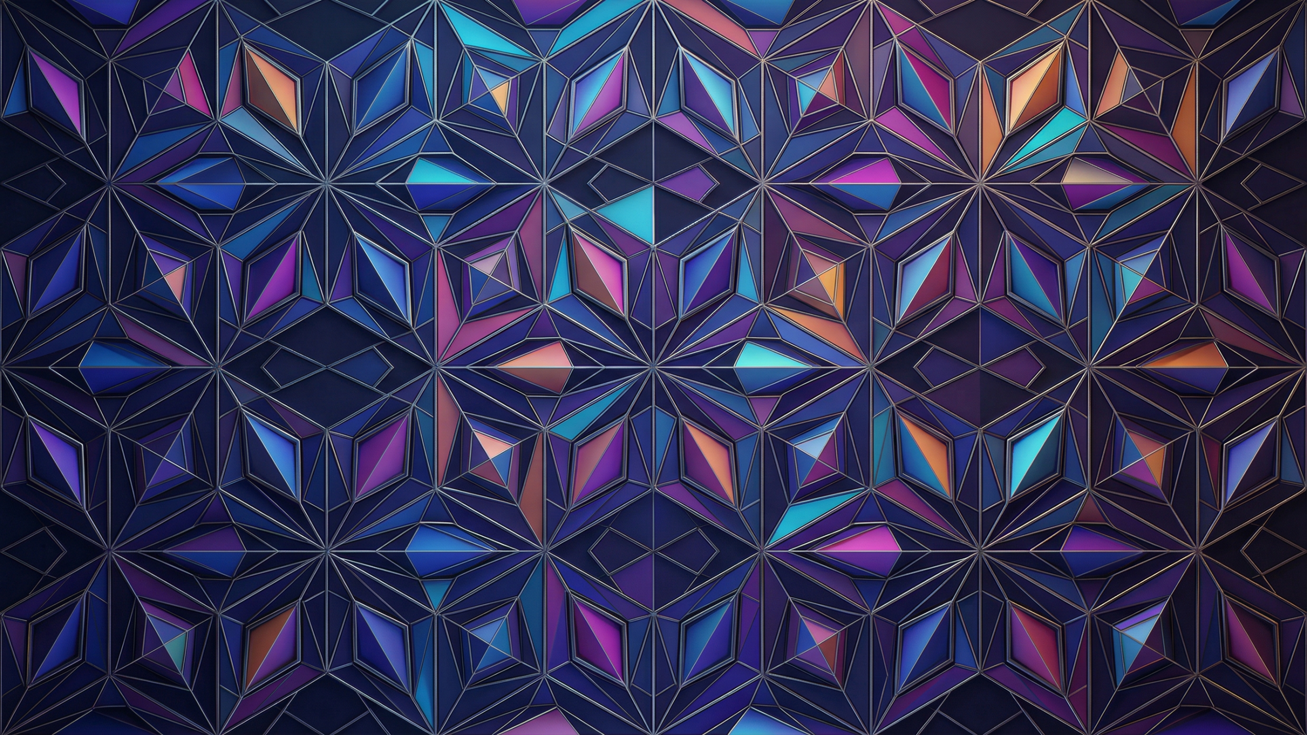 青や紫をベースに、ピンクやオレンジなどの鮮やかな色彩が散りばめられた幾何学模様のPC壁紙です。