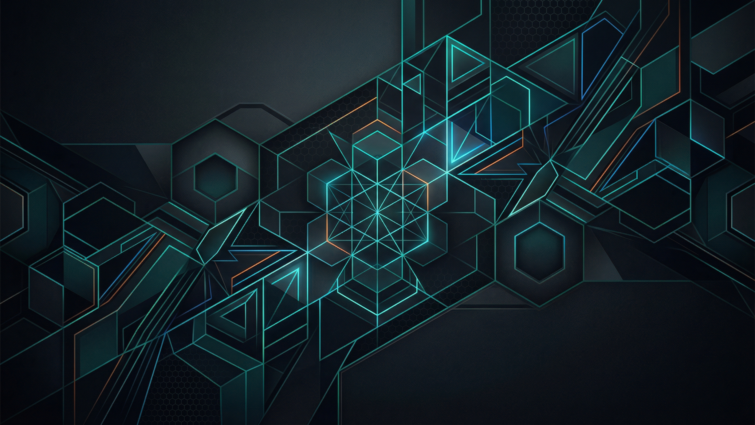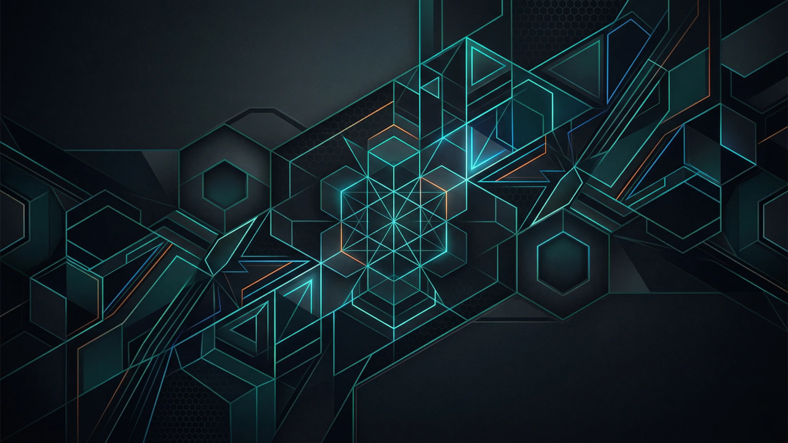 六角形をベースにしたテクノロジー風の幾何学模様のPC壁紙です。