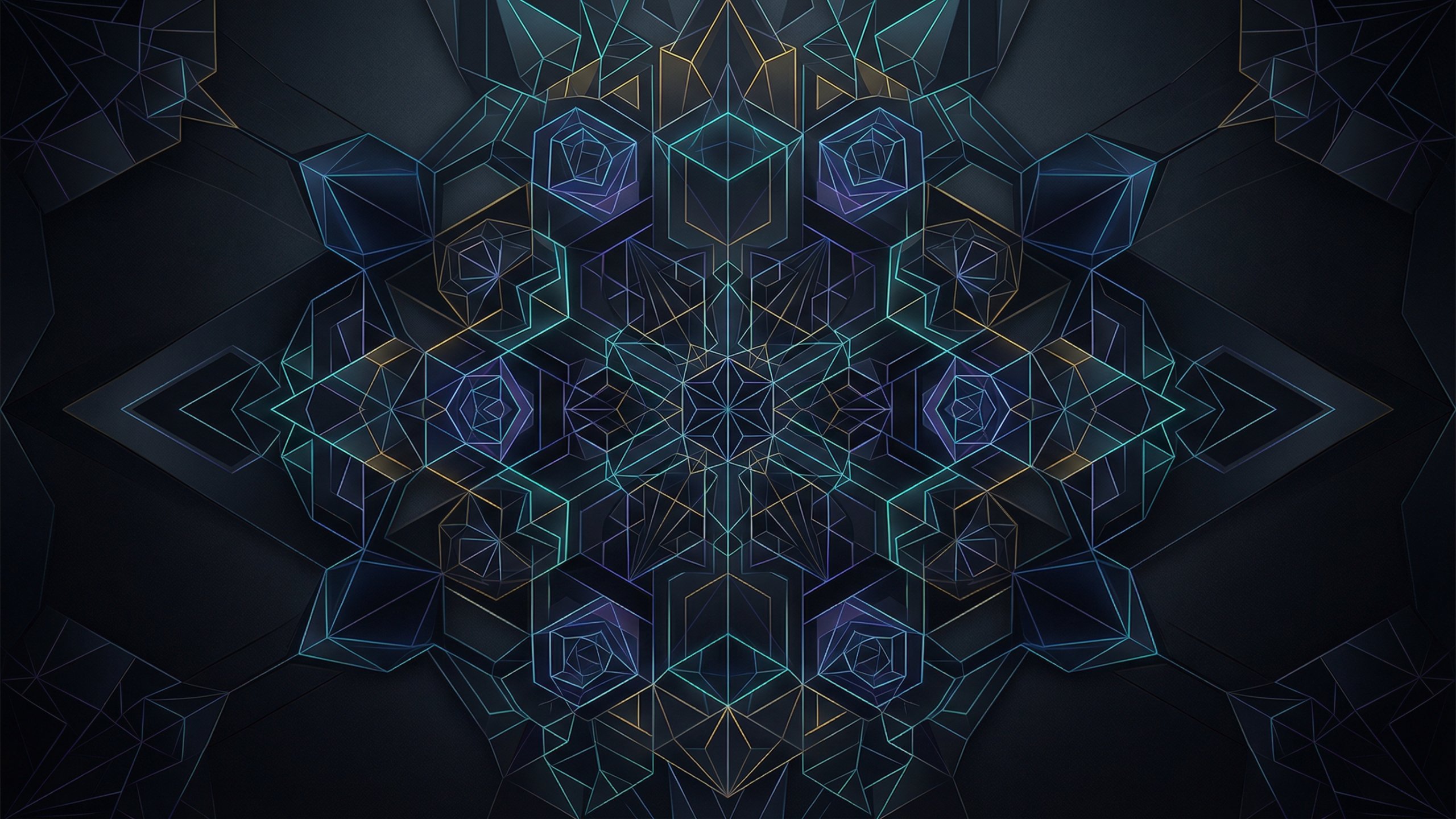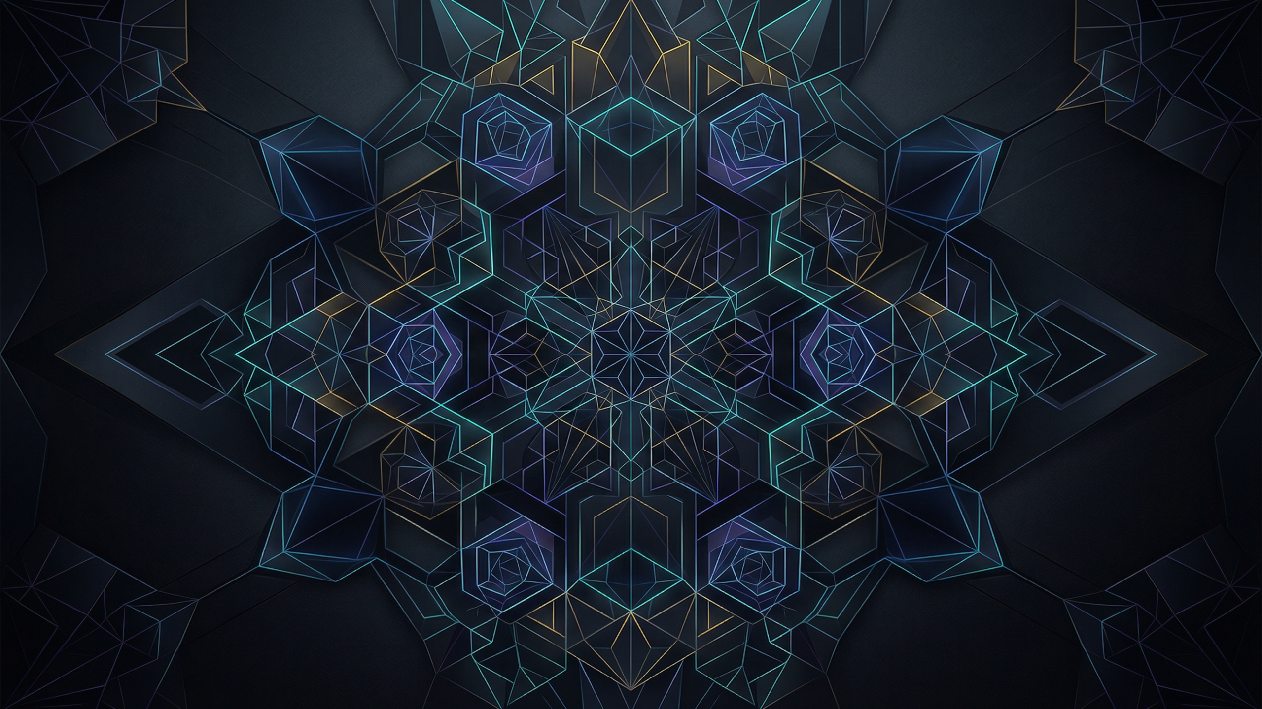 細いラインで描かれた幾何学図形が中心から放射状に広がるシンメトリーデザインのPC壁紙です。