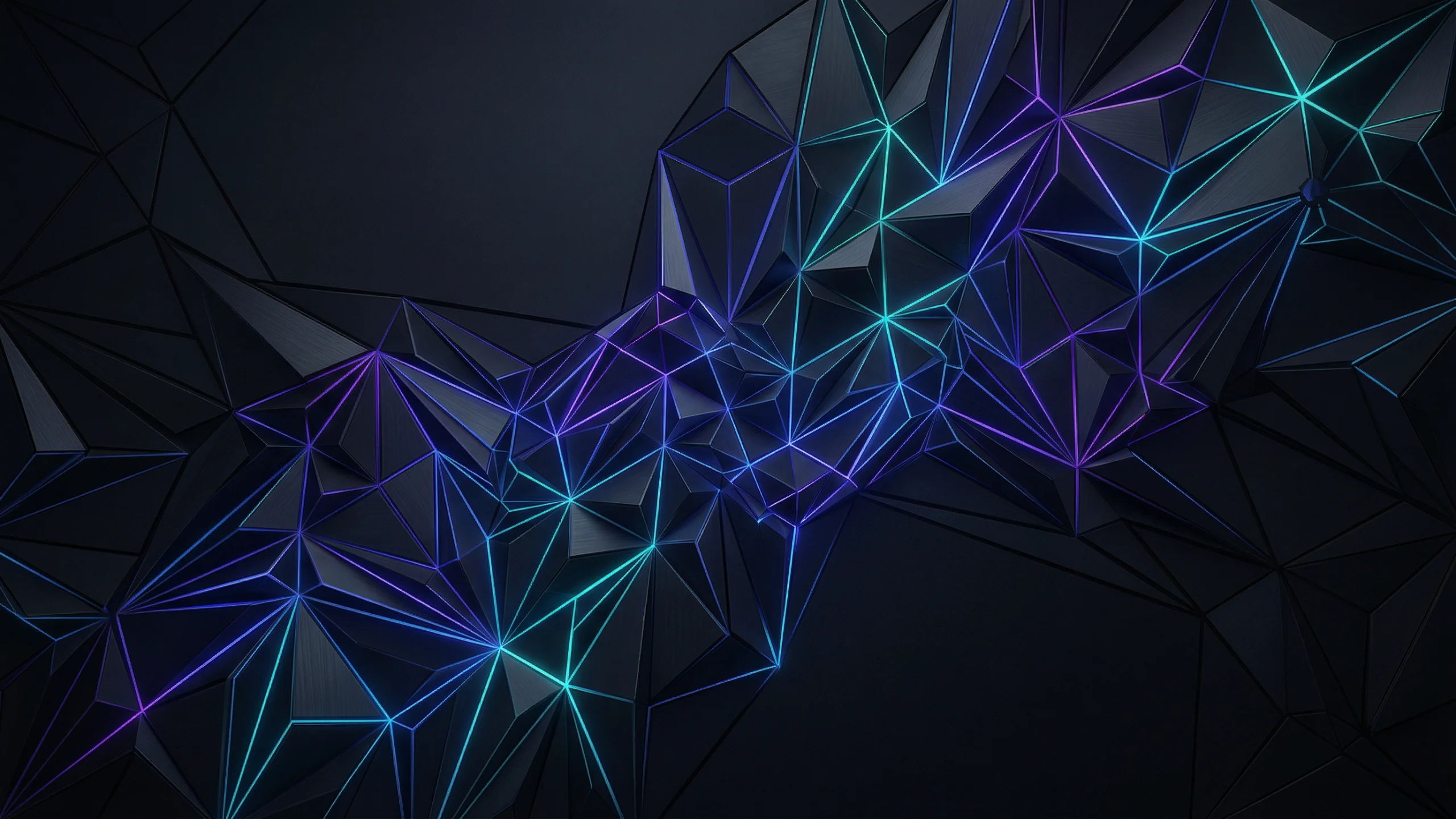 黒を基調とした背景に、青や紫の光を帯びたローポリゴン風の多面体が連なる幾何学模様のPC壁紙です。