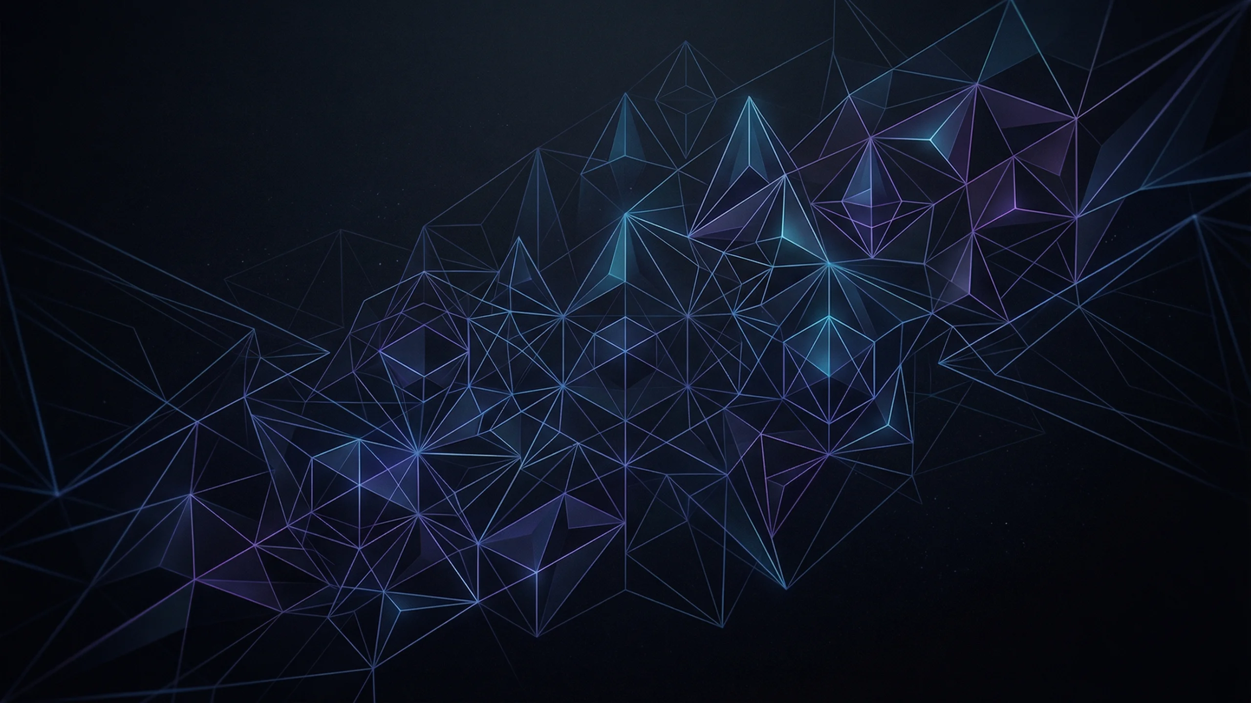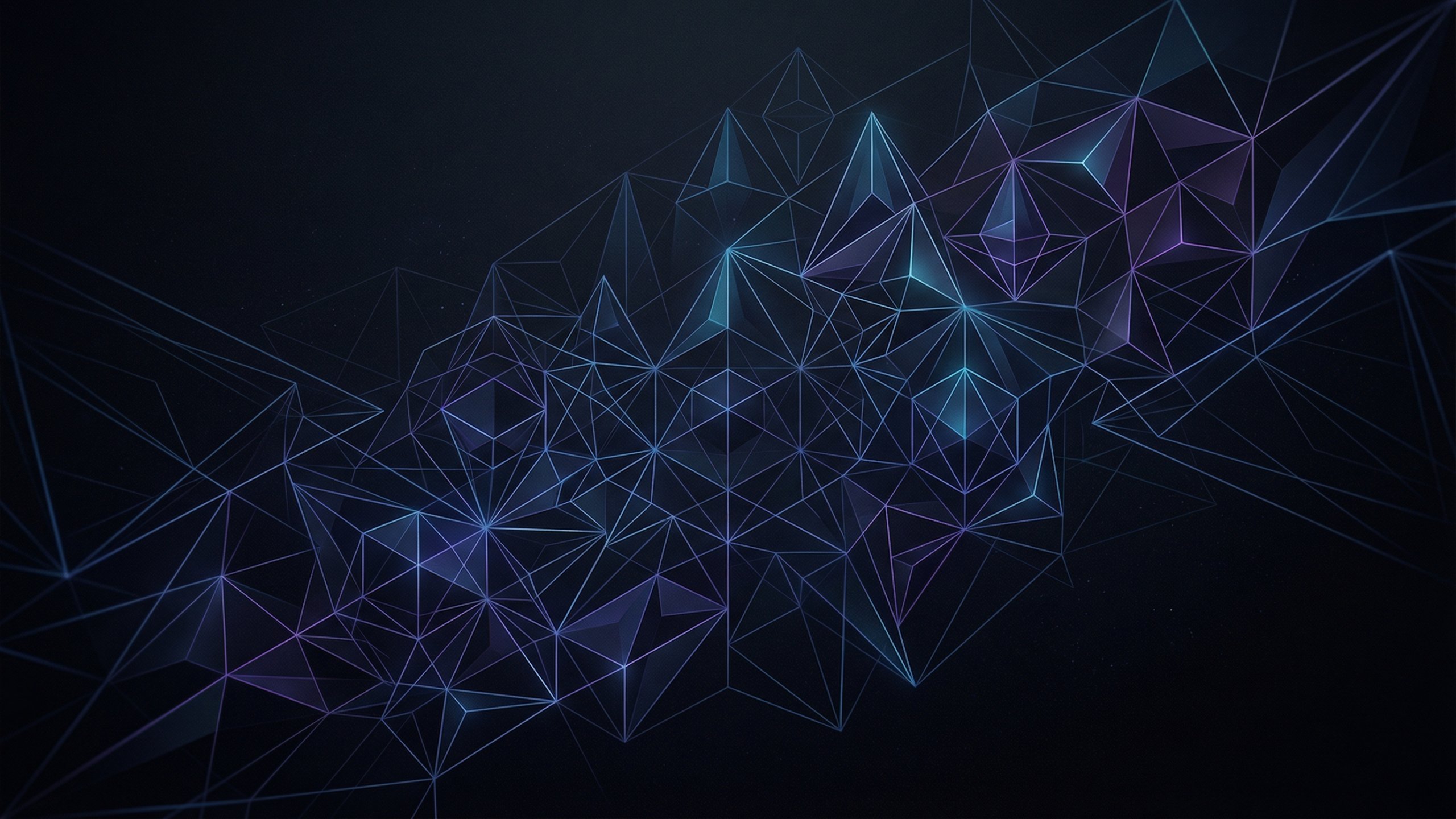 黒に近いダーク背景に、青や紫のグラデーションで描かれたポリゴン構造が広がる幾何学模様のPC壁紙です。