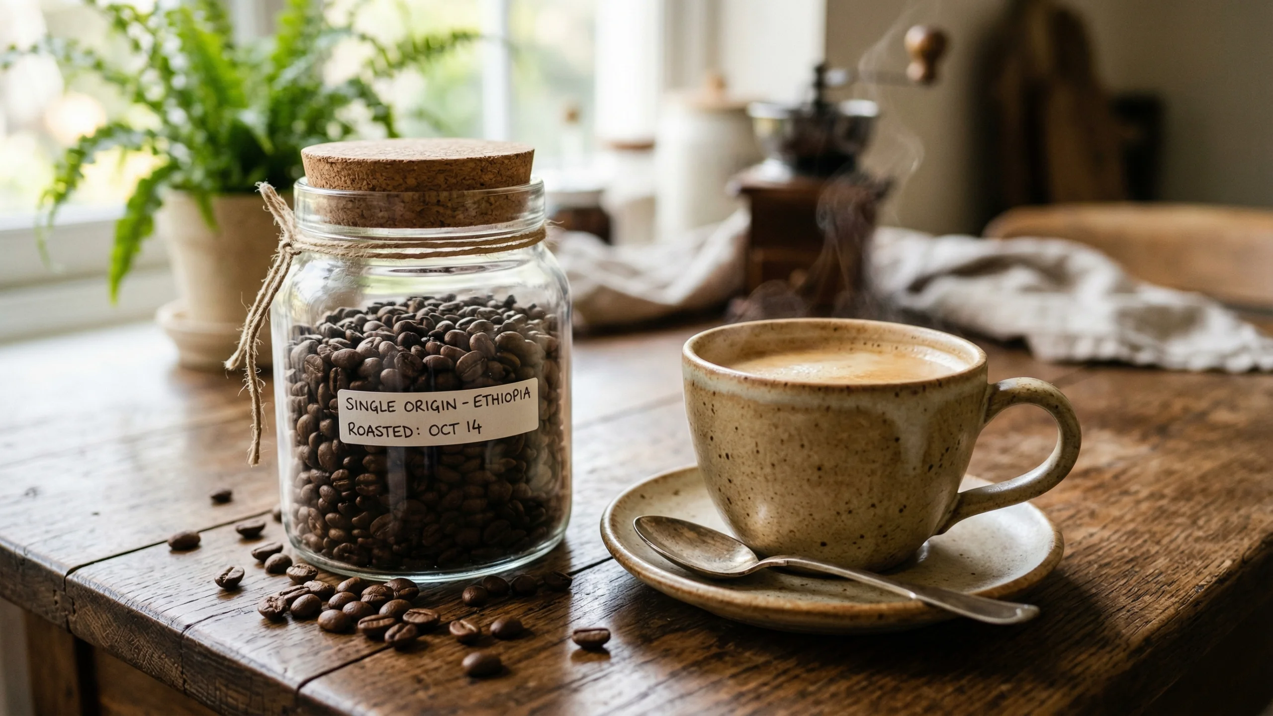 手書きラベル・散らばったコーヒー豆・コーヒーミル・観葉植物・窓からの柔らかな自然光が組み合わさり、自家焙煎カフェやコーヒー専門店を思わせる温かみある空間を演出しています。
