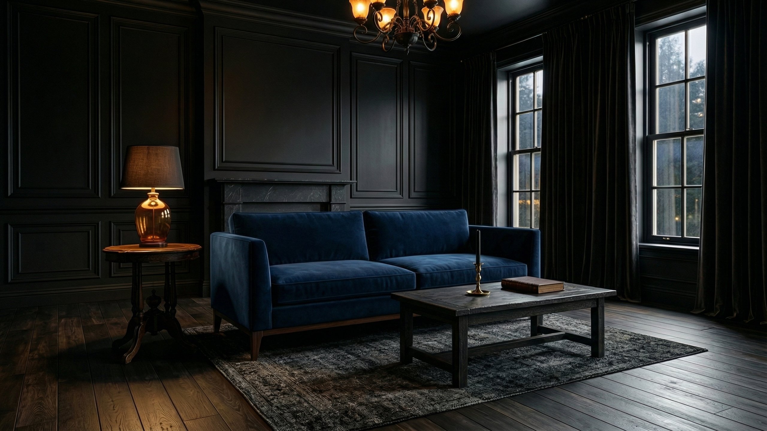 ゴシックダークなリビングルームとネイビーのベルベットソファ 2のPC壁紙、背景画像は以下の形式でダウンロードができます。