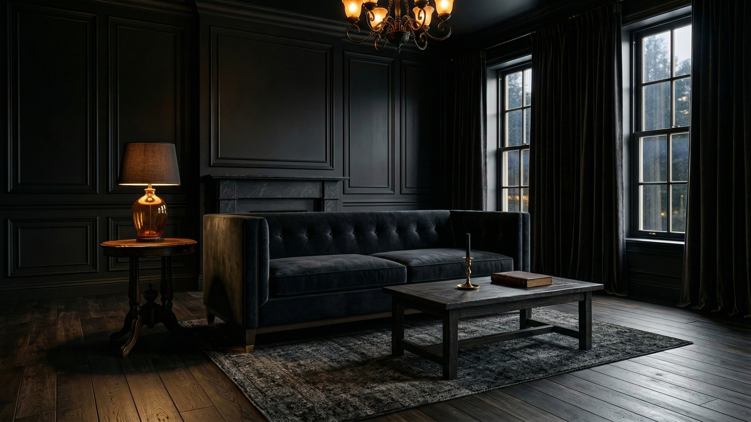 ゴシックダークなリビングルームとネイビーのベルベットソファ