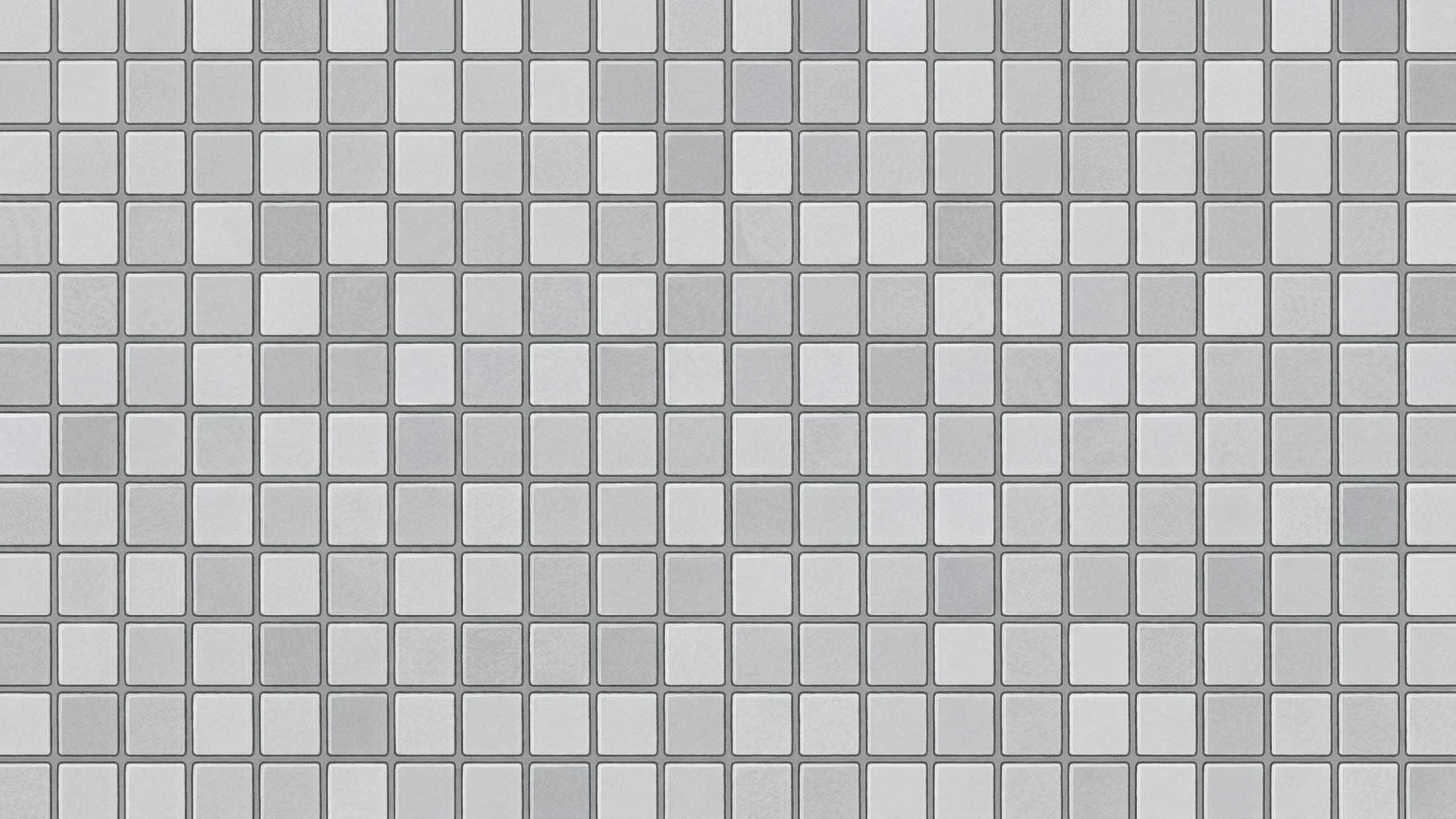 白・ライトグレー・ミディアムグレーのタイルがランダムに配置された、グレースケールのモザイクタイル柄のPC壁紙画像です。
