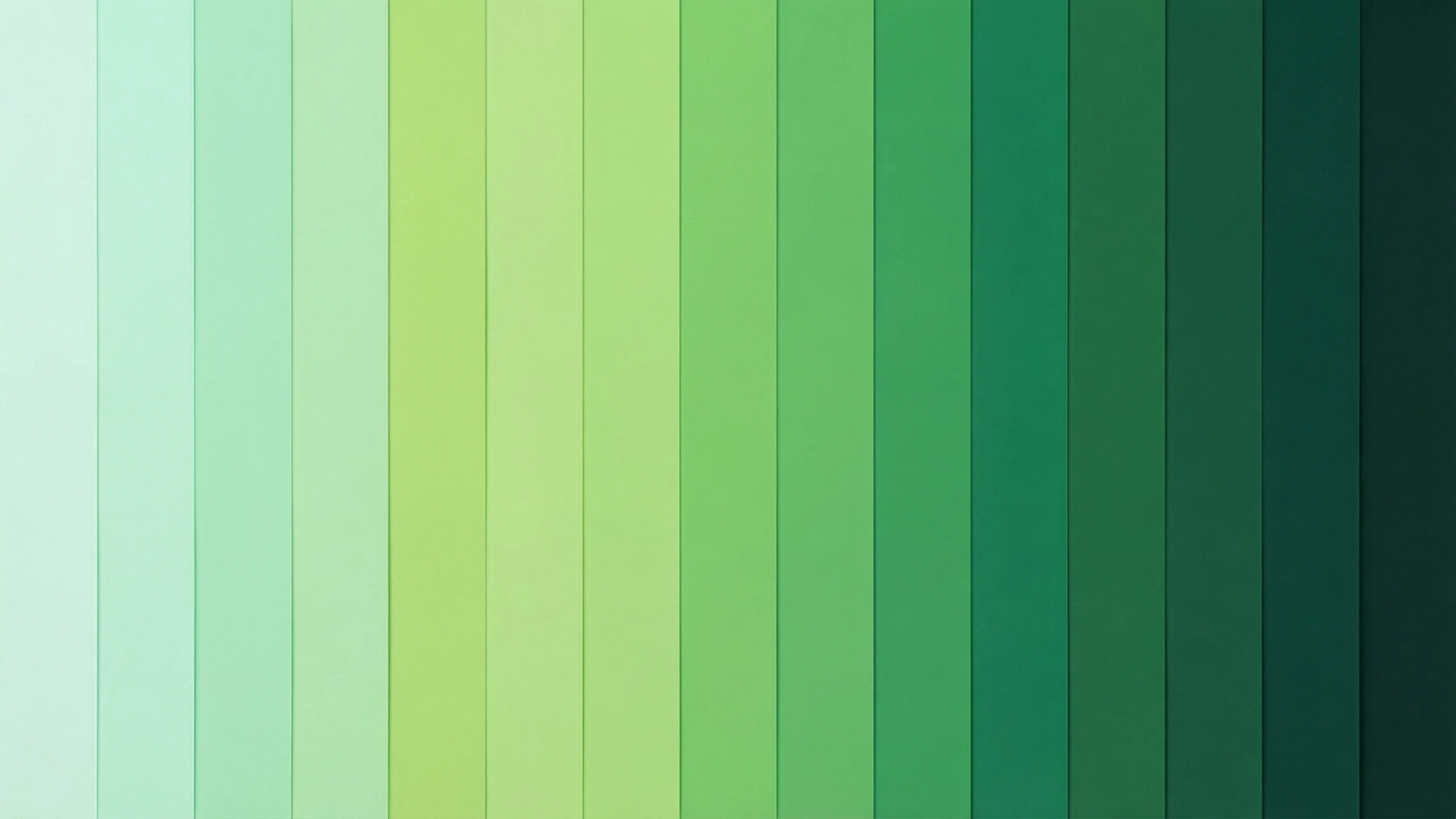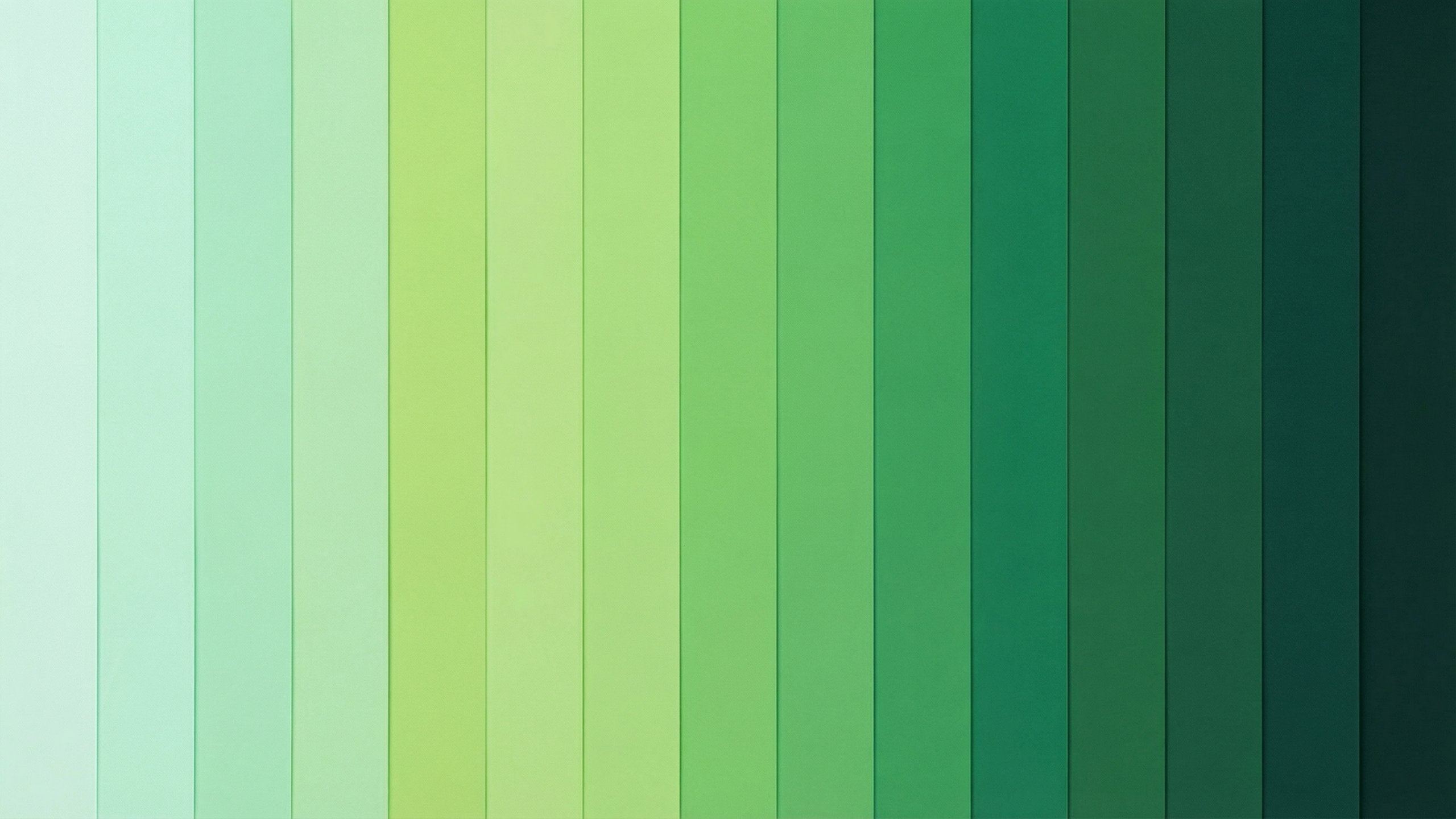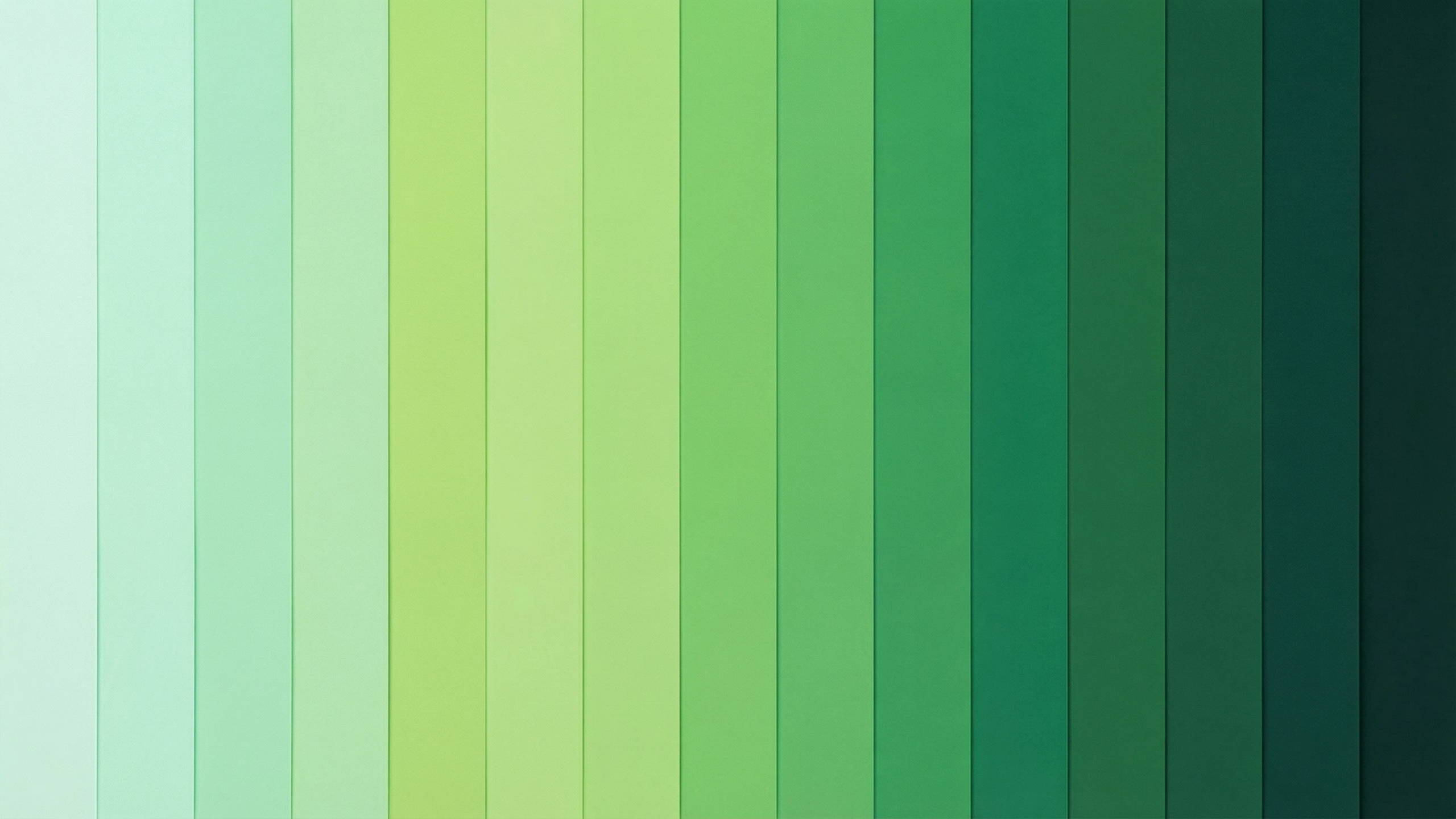 淡いミントホワイトからダークフォレストグリーンへと段階的に変化する、グリーン系グラデーションの縦ストライプPC壁紙画像です。