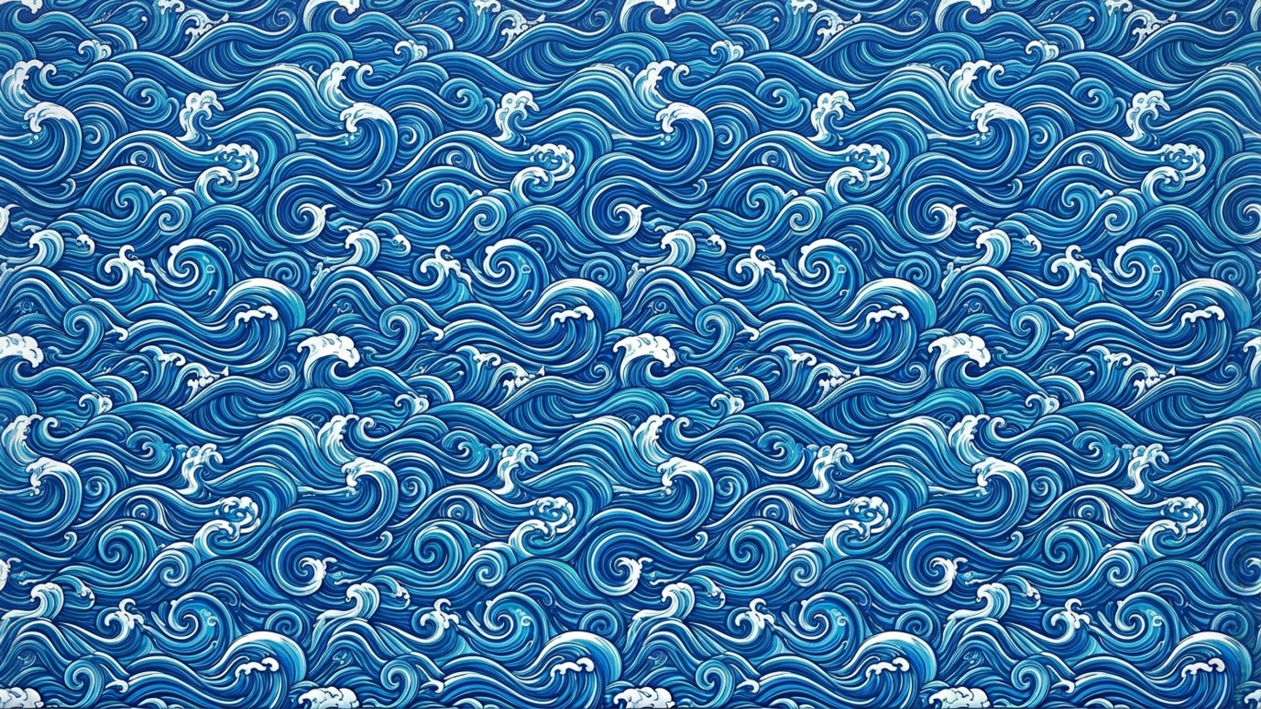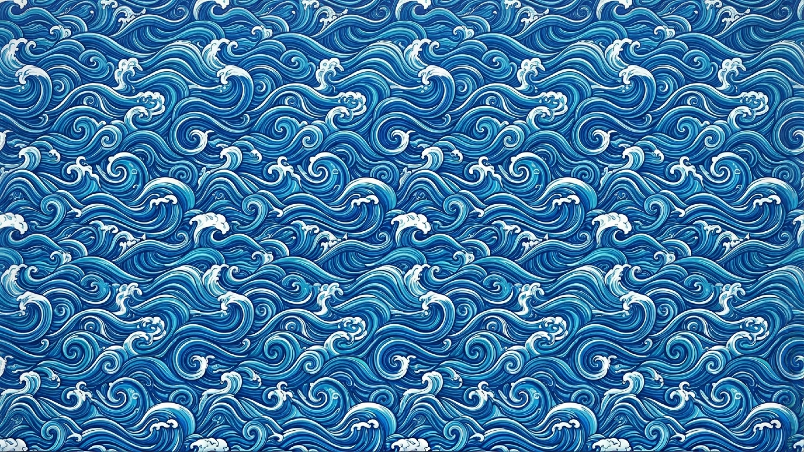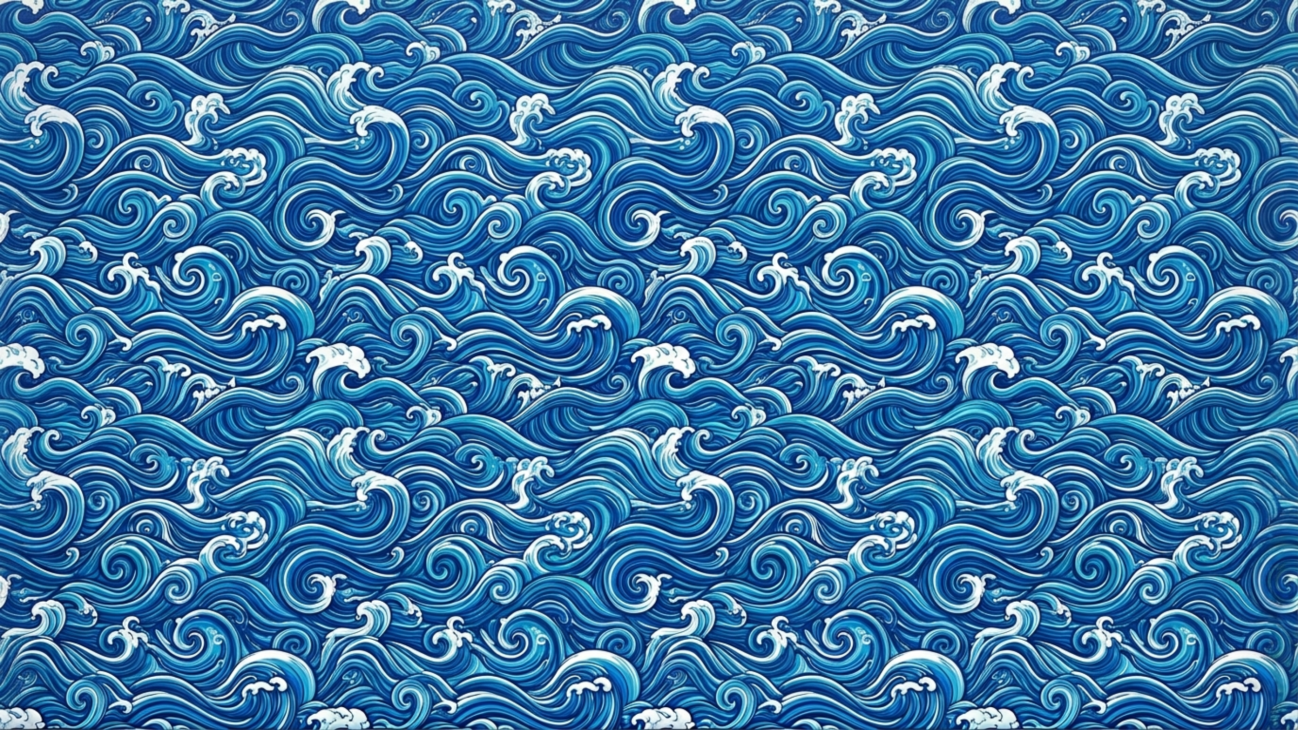 渦巻く波頭と白い飛沫が画面いっぱいに繰り返される、日本の伝統的な波模様をイラスト風に描いたPC壁紙画像です。