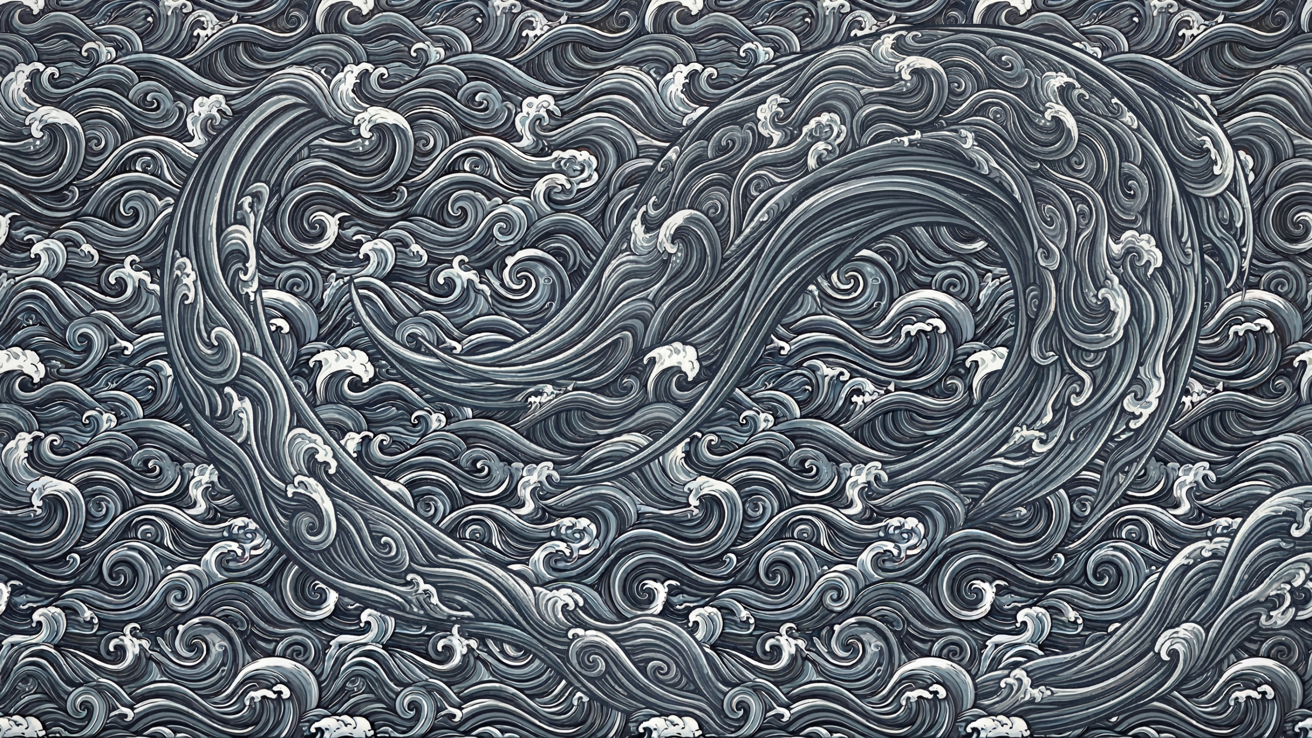 細かな波模様のパターンの中に、画面中央を大きく占める巨大な渦巻き波が描かれた、日本の伝統的な波模様イラストのグレースケール版PC壁紙画像です。