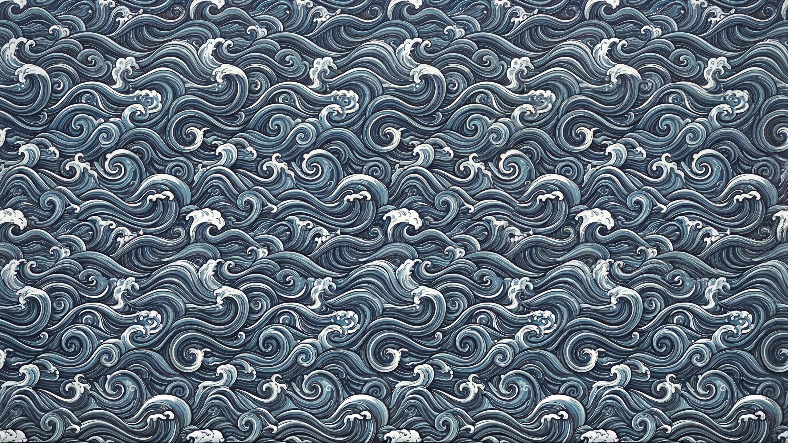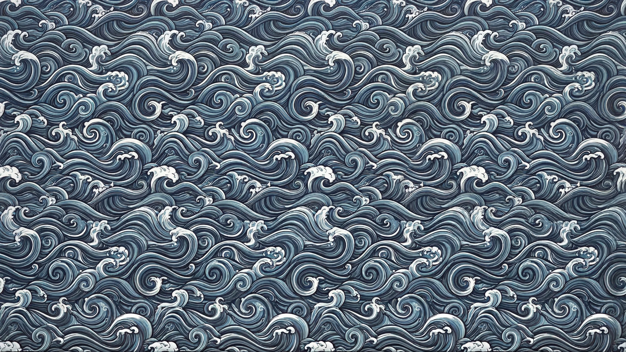 渦巻く波頭と白い飛沫が画面いっぱいに繰り返される、日本の伝統的な波模様をイラスト風に描いたPC壁紙画像です。