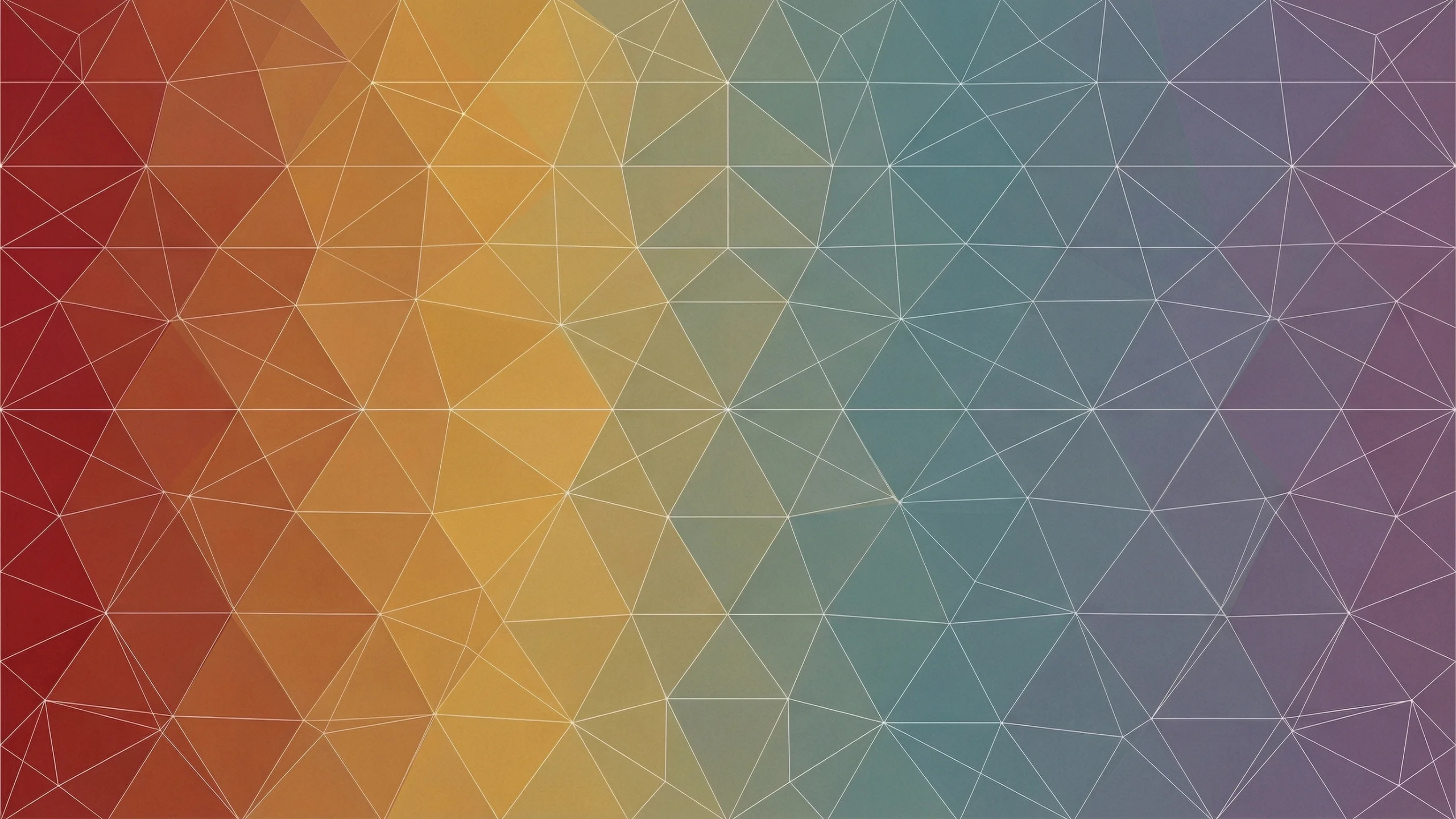 レッド・オレンジ・イエロー・ティールグリーン・ブルー・パープルへと横方向に変化するレインボーグラデーションの背景に、細い白いラインで描かれた六角形と三角形の組み合わせによるローポリ幾何学パターンが均一に敷き詰められたPC壁紙です。