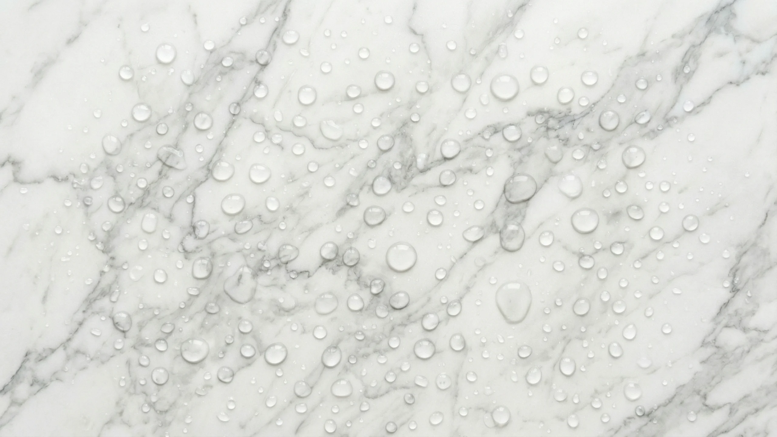白大理石の表面に透明な水滴がいくつか散らばった、清潔感のあるPC壁紙素材です。