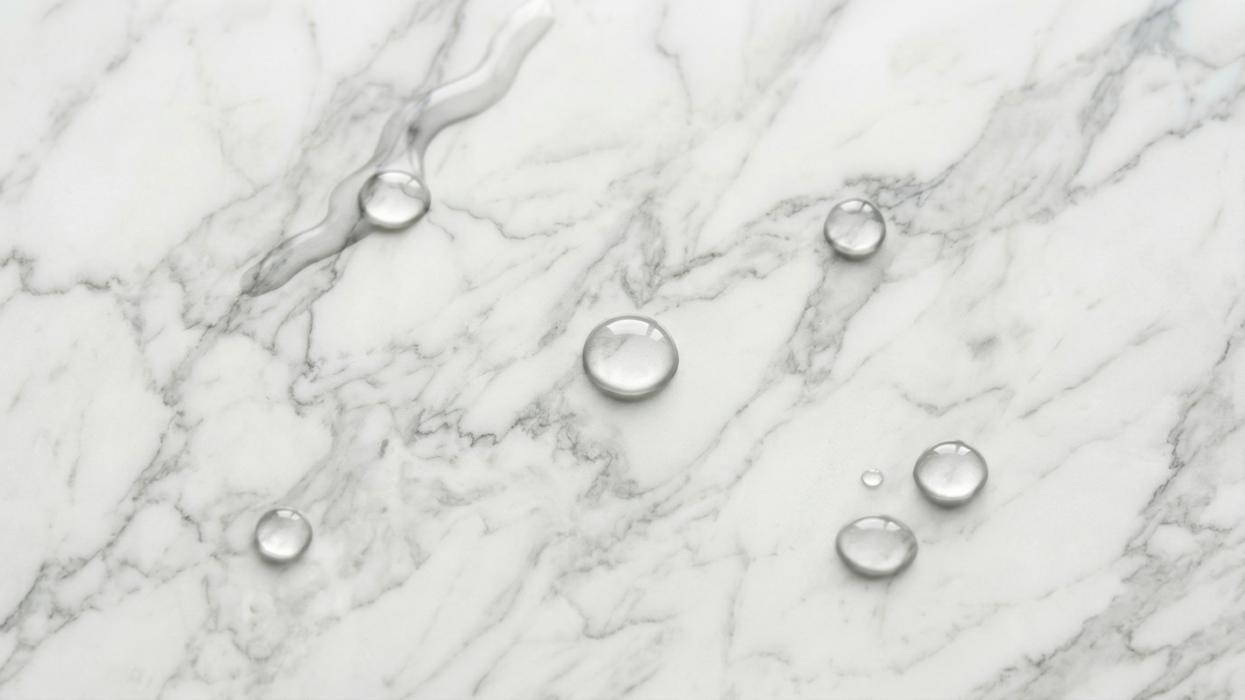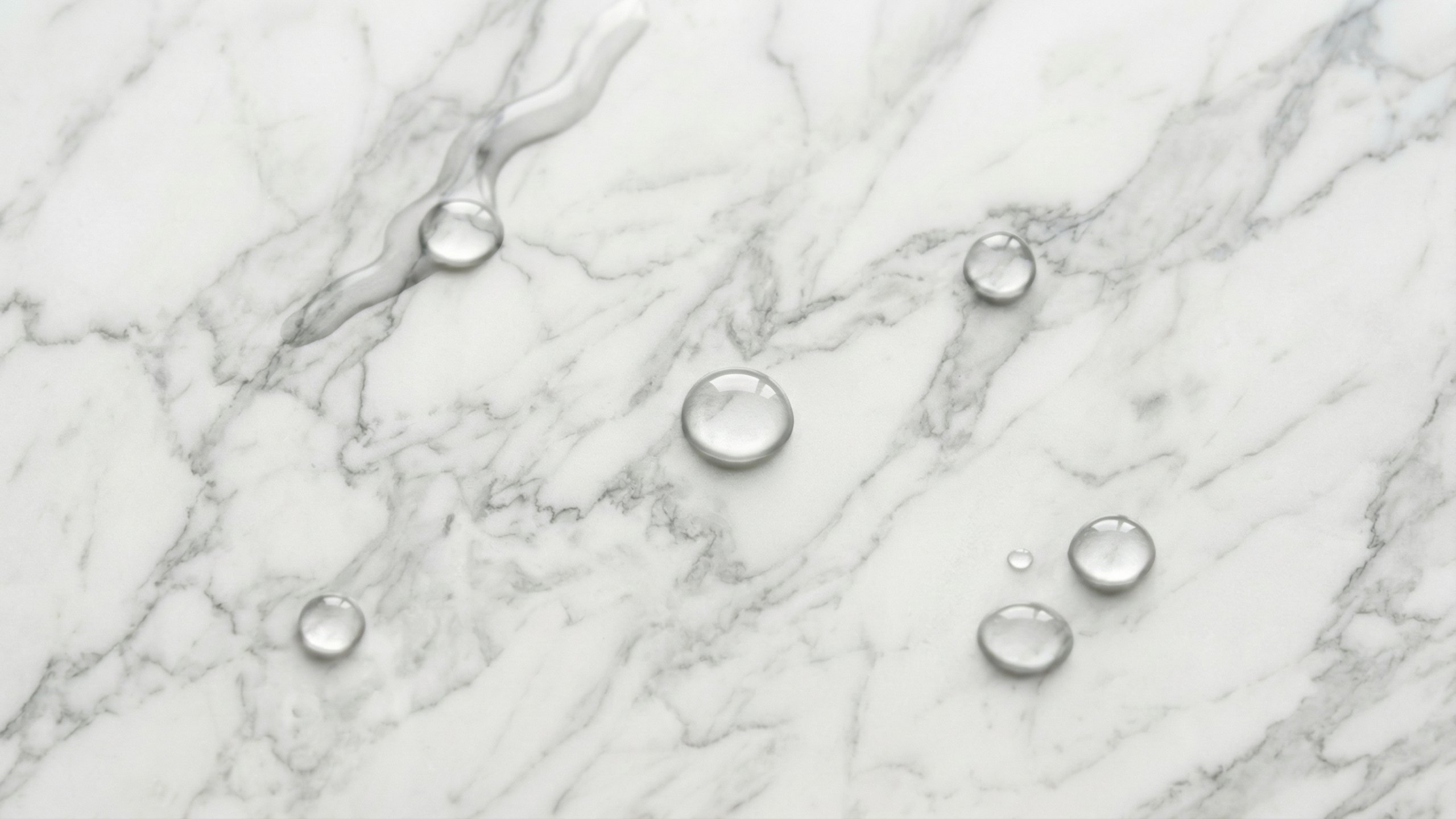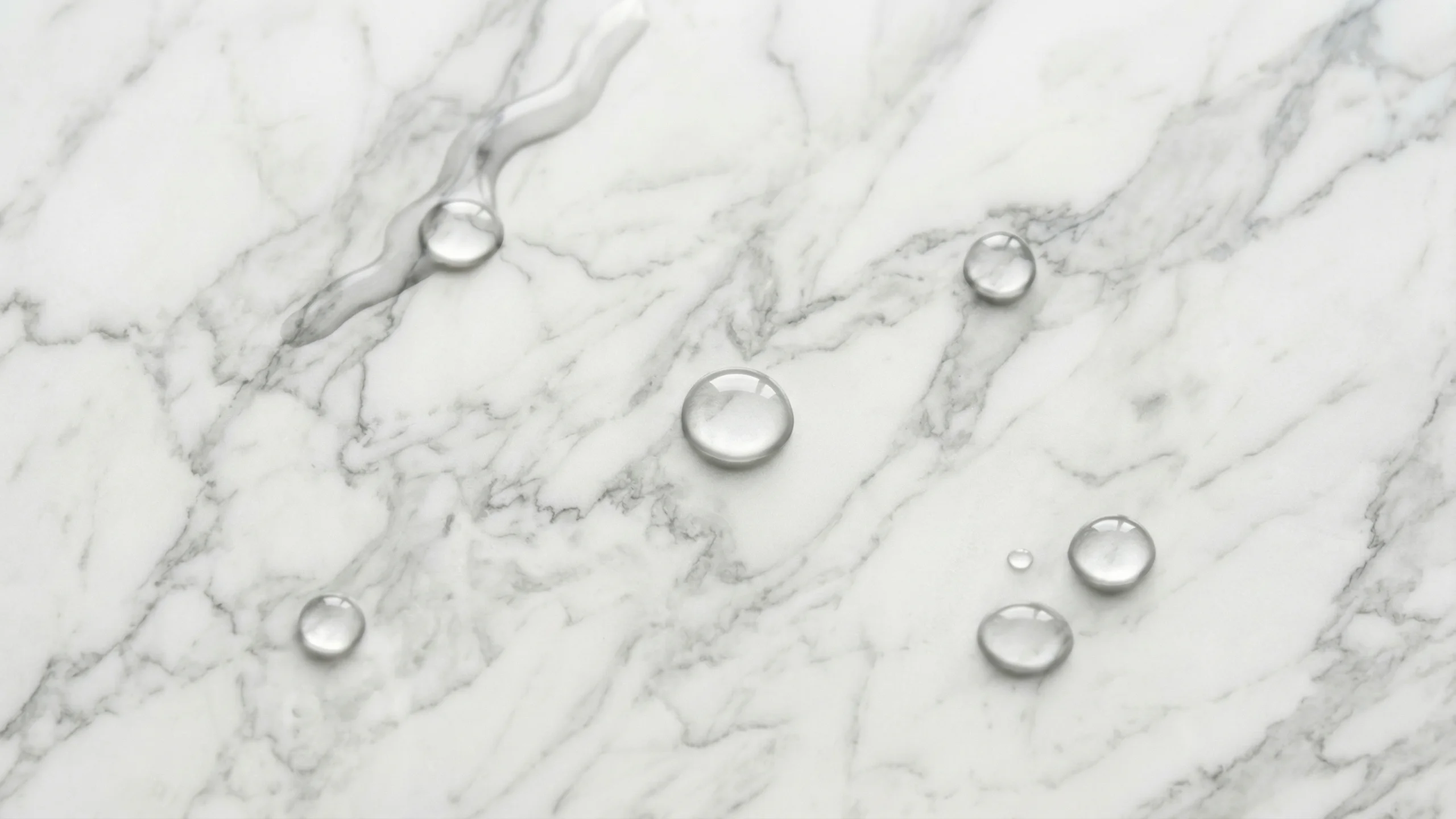 白大理石の表面に透明な水滴がいくつか散らばった、清潔感のあるPC壁紙素材です。