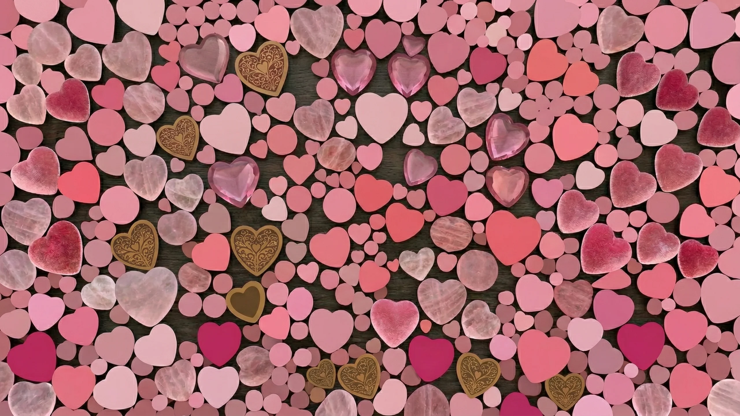 大小さまざまなハート型がフラットなピンク・ベルベット・マーブル・クリスタル・ゴールドの装飾入りなど多彩な素材感で画面いっぱいに散りばめられたPC壁紙画像です。