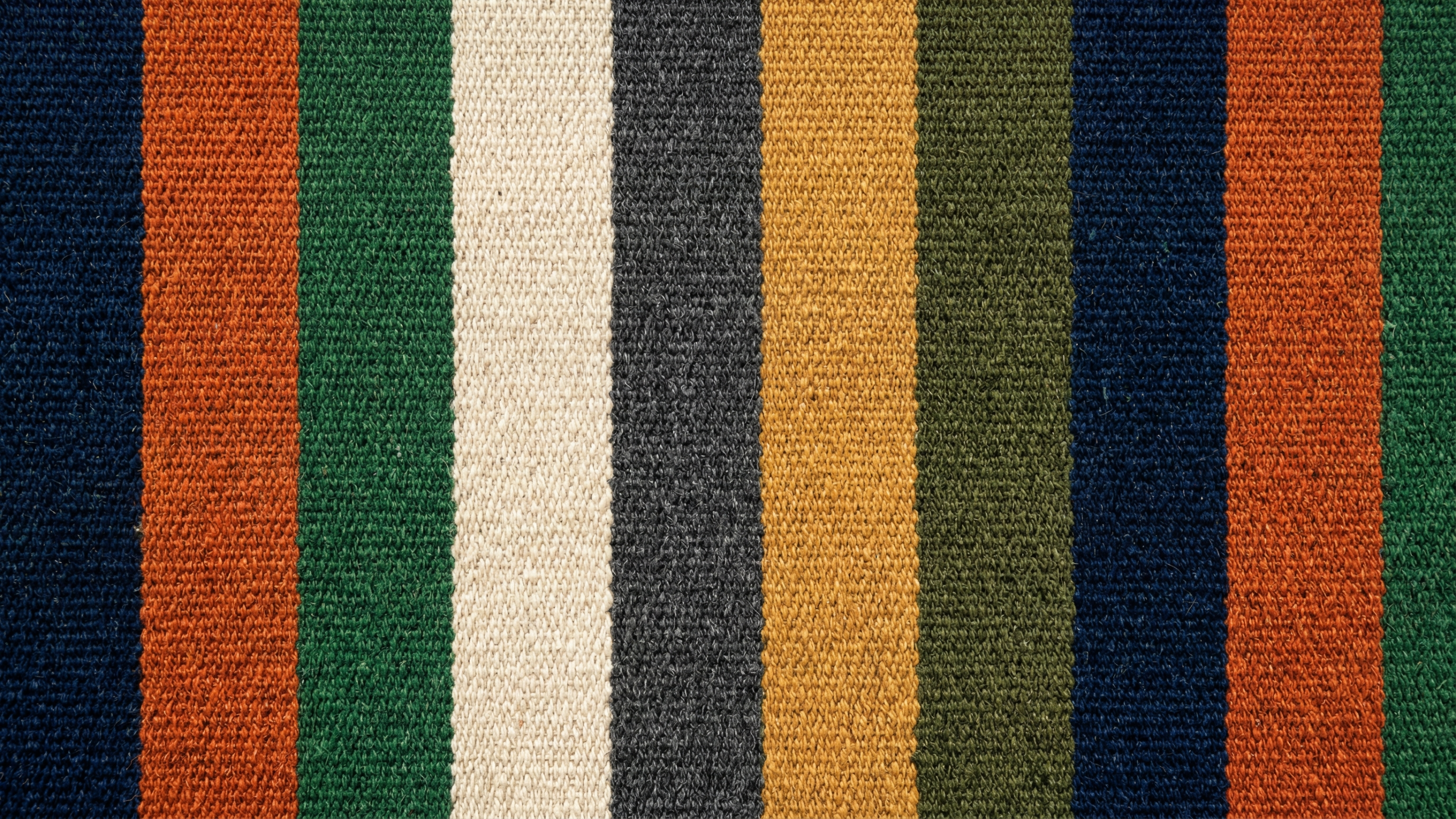 ネイビー・オレンジ・グリーン・アイボリー・チャコール・ゴールド・オリーブなど多彩な色が並ぶ縦ストライプ柄の織物テクスチャPC壁紙です。