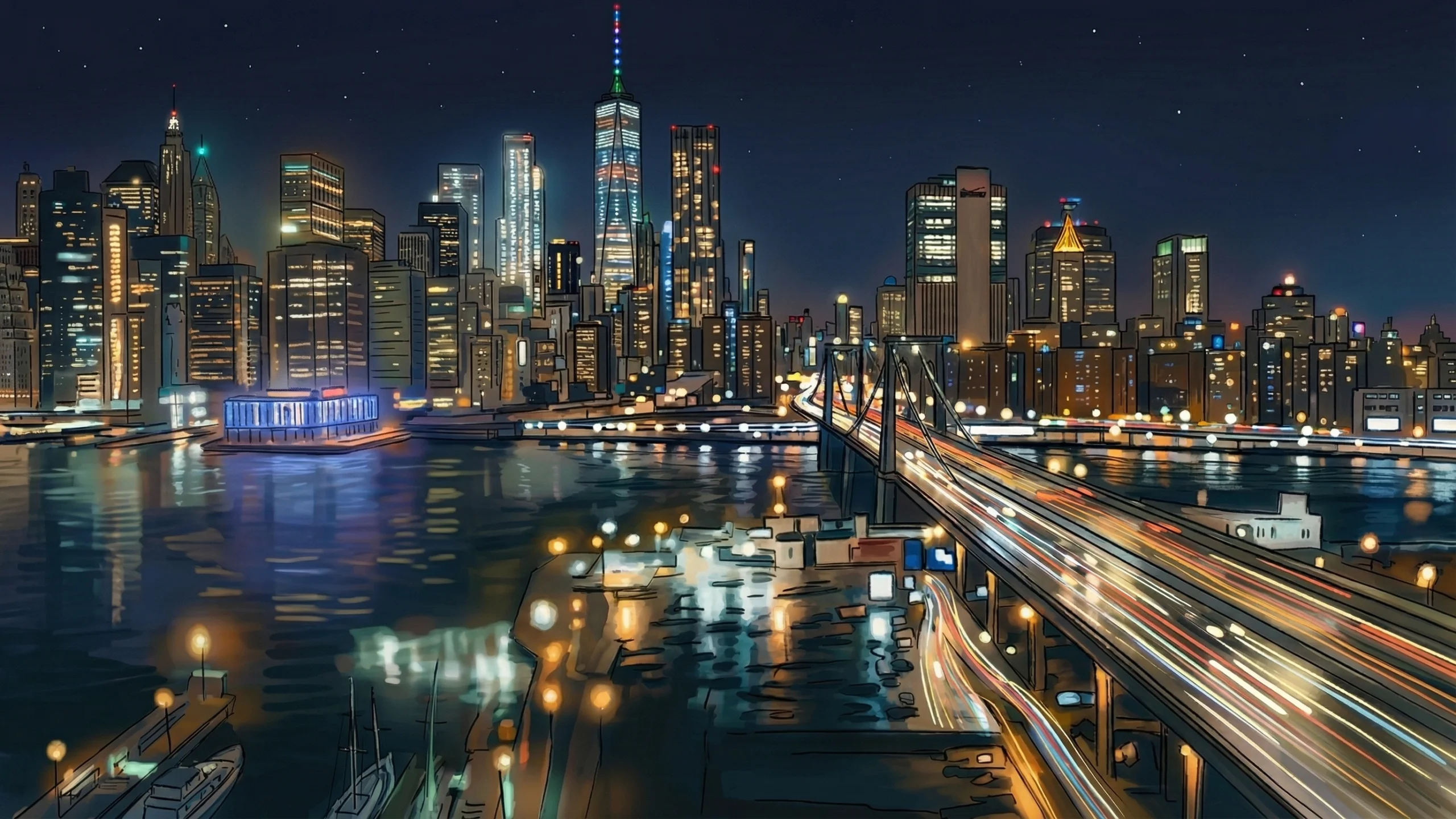 ワン・ワールド・トレード・センターを中心とした高層ビル群、橋と高速道路の光のトレイル、川面に映り込むカラフルな都市の光が、くっきりとした黒い輪郭線と柔らかなデジタル彩色で表現されています。