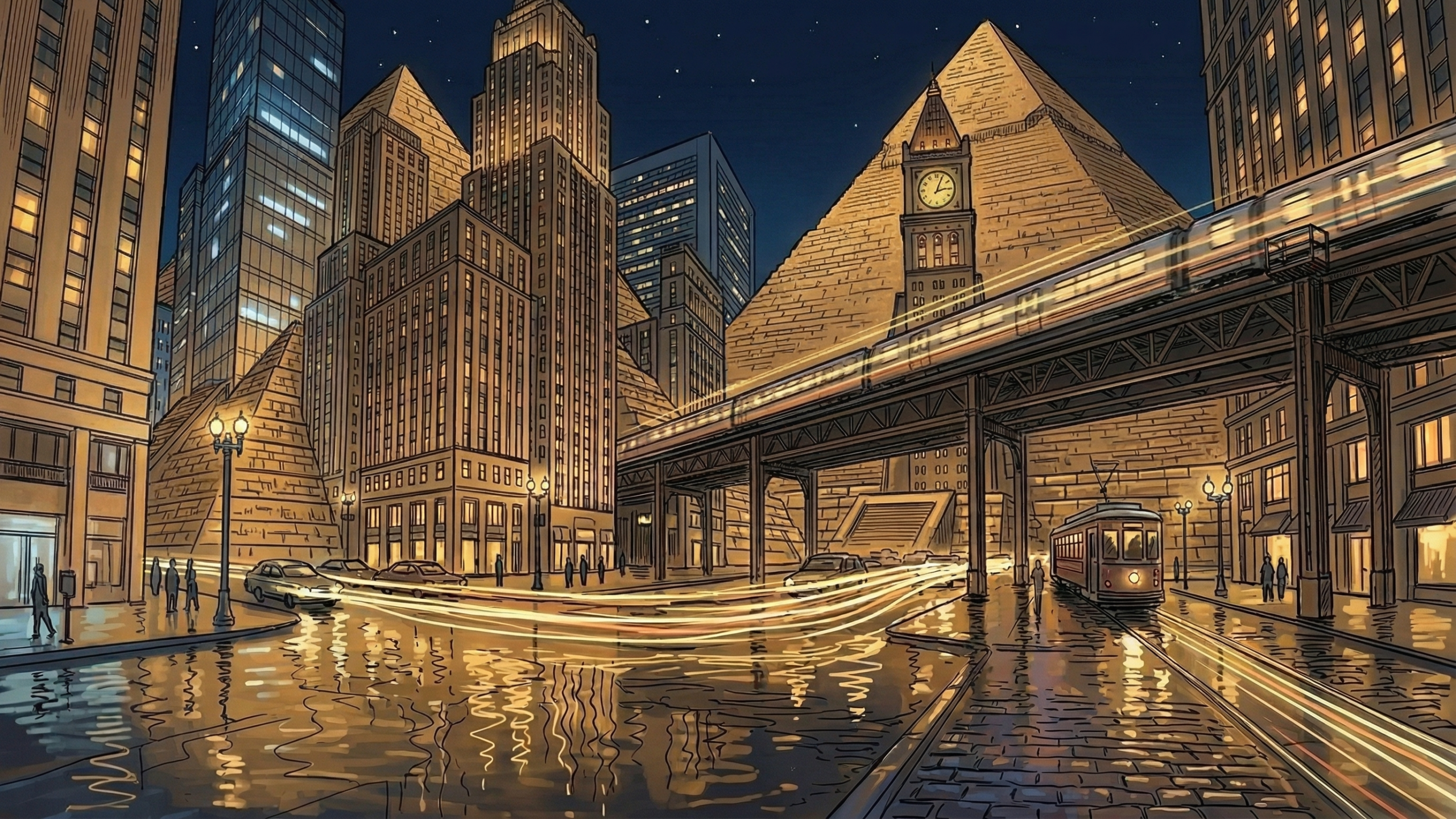 古代エジプトのピラミッドと近代的な高層ビル群が共存するファンタジックな夜の都市景観を描いたPC壁紙イラスト画像です。