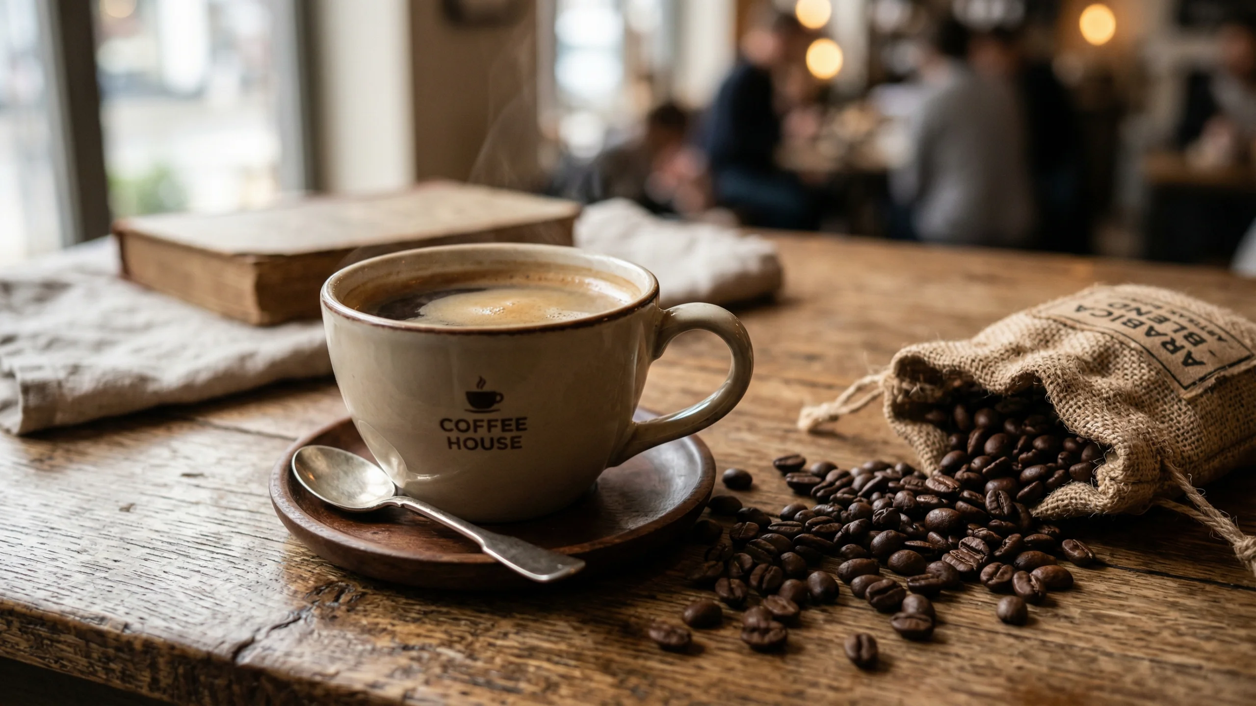 湯気立つコーヒーカップと麻袋のカフェ風景