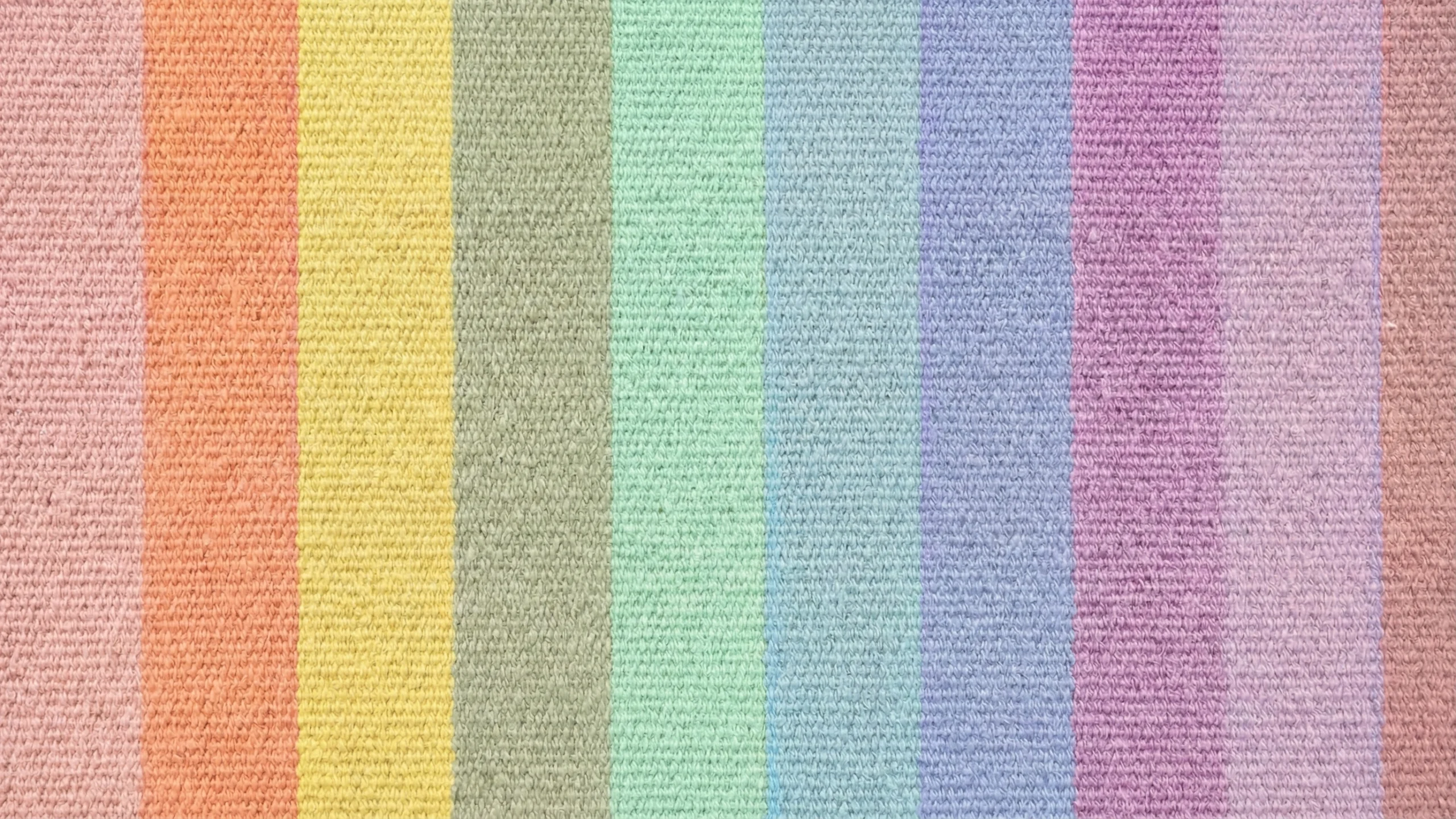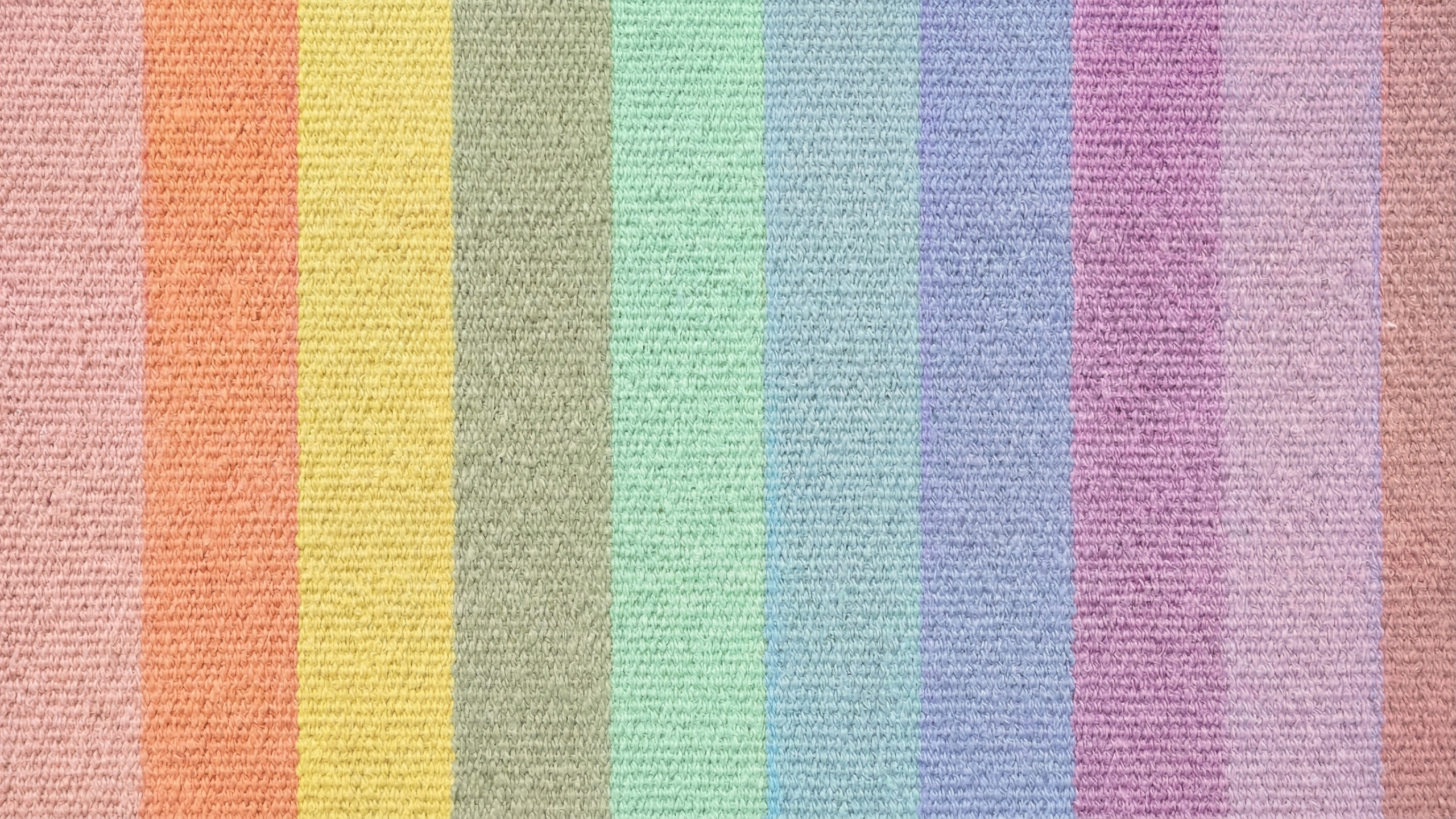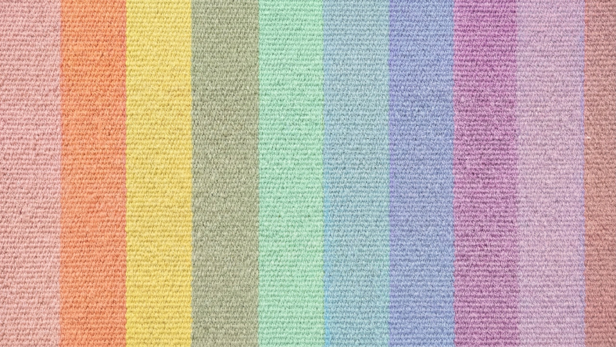 ラベンダー・パープル・スカイブルー・ミントグリーン・イエロー・オレンジ・コーラルレッドが虹のように並ぶ縦ストライプ柄の織物テクスチャPC壁紙です。