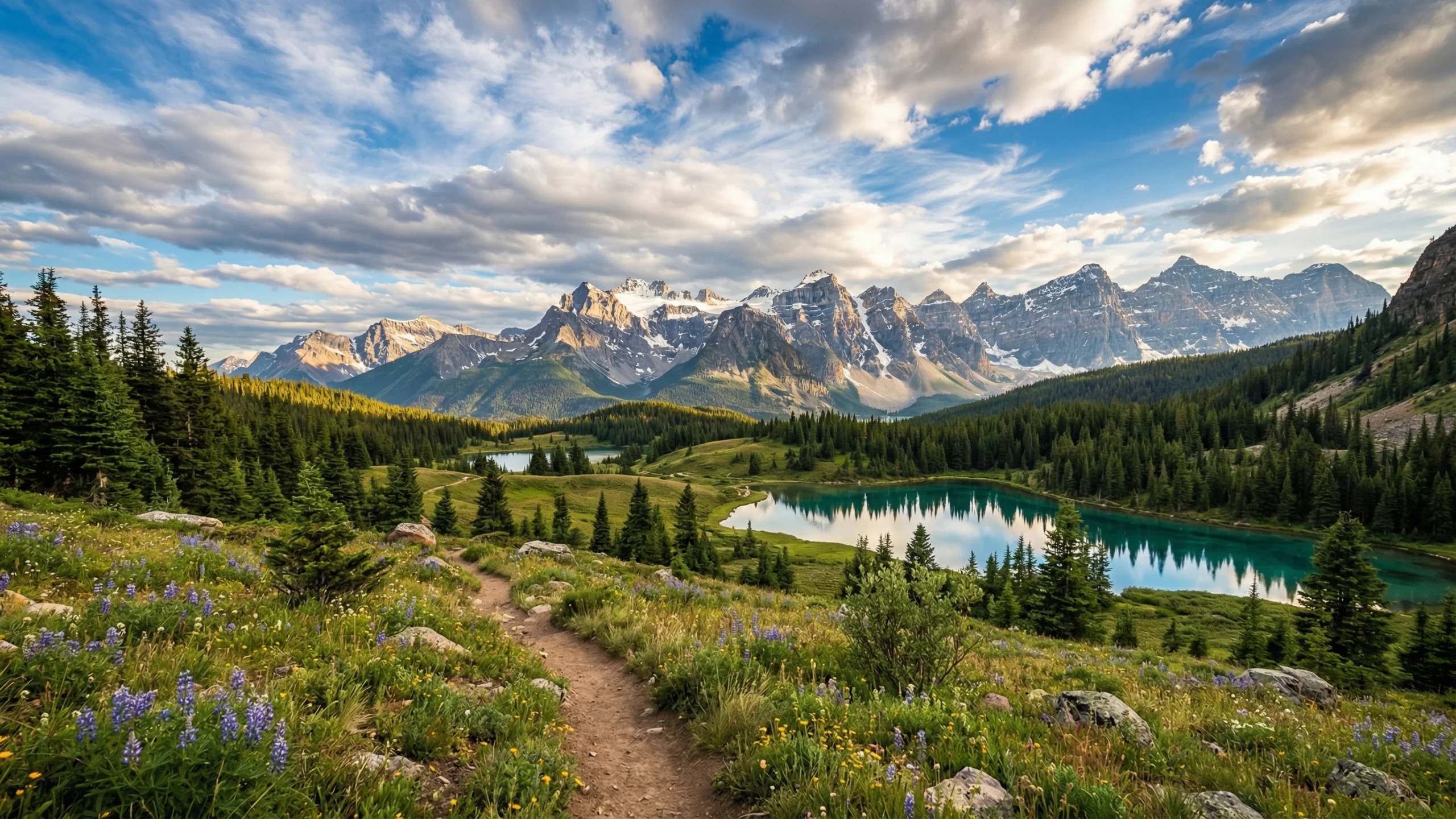 ルピナスや野花が咲く岩がちな登山道を背景に、ターコイズブルーの高山湖と圧倒的な迫力の山脈が広がる夏の絶景PC壁紙です。