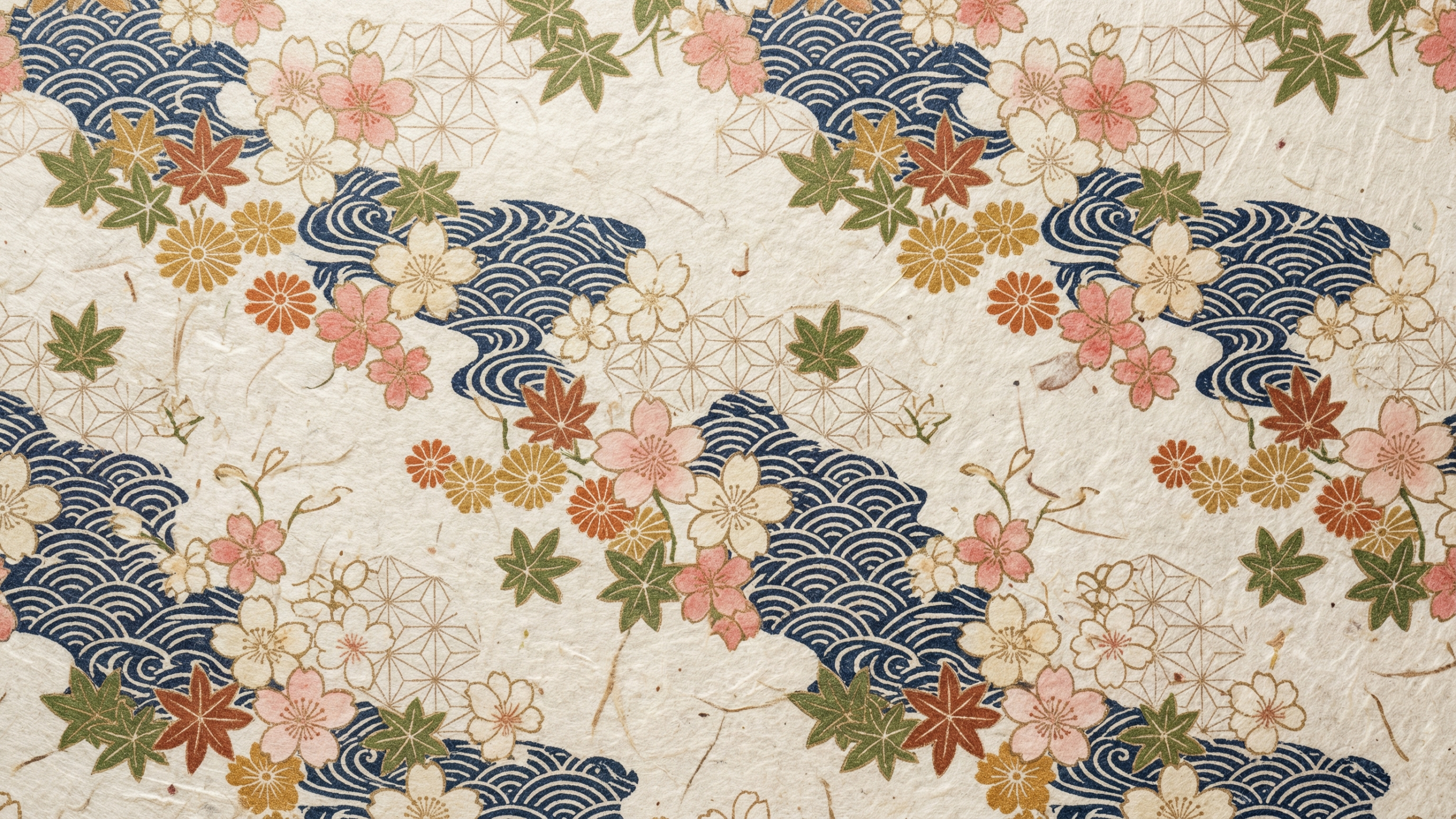 クリーム色の和紙の質感を背景に、桜・紅葉・菊・麻の葉・青海波などの伝統的な和柄が散りばめられたPC壁紙素材です。